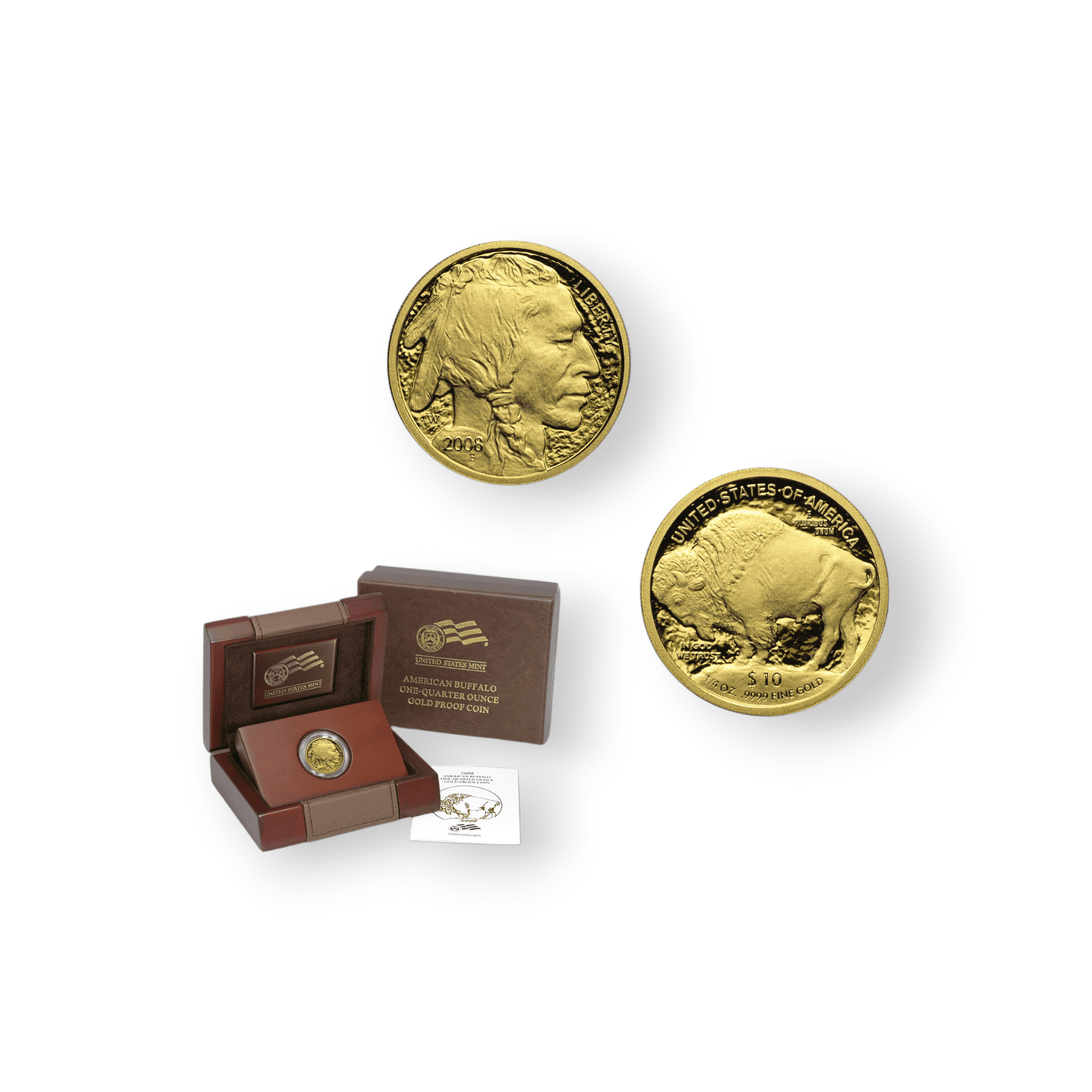 The 2008-W 1/4 oz Proof Gold Buffalo coin, crafted at the distinguished West Point Mint, is a brilliant embodiment of American numismatic artistry. Struck in .9999 pure gold and with a specific mintage of 13,125, this coin exudes the lustrous sheen typical of proof strikes. It reverently showcases James Earle Fraser's iconic 1913 Buffalo Nickel design, with the obverse detailing a Native American profile and the reverse highlighting the storied American buffalo, Black Diamond. A confluence of historical reverence and impeccable craftsmanship, the coin is a vivid reminder of the nation's storied past. Housed in its original mint box and accompanied by a Certificate of Authenticity (COA), this proof coin is an esteemed collectible for discerning numismatists and admirers of U.S. minted masterpieces.