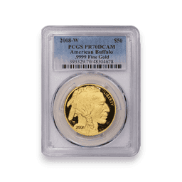 The 2008-W Proof Buffalo 1 oz $50 Gold Coin, PCGS Certified, is a notable addition to the world of coin collecting, minted in ultra-fine .9999 gold. This exquisite piece features the classic design of the Buffalo Nickel by James Earle Fraser, showcasing an American Bison on one side and a Native American profile on the other. Produced at the West Point Mint, as indicated by the 'W' mintmark, this coin is a part of the U.S. Mint's exclusive series of 24-karat gold coins. The proof quality of the coin, with its exceptional detail and a brilliant, mirror-like finish, emphasizes the craftsmanship and beauty of Fraser's design. It has been certified by the Professional Coin Grading Service (PCGS), ensuring its authenticity and pristine condition. The exact mintage of the 2008-W Proof Buffalo Gold Coin is 18,863, making it a relatively rare and sought-after piece in the numismatic community. Its rarity, combined with its historical significance and the purity of its gold content, enhances its appeal and value to collectors and investors.