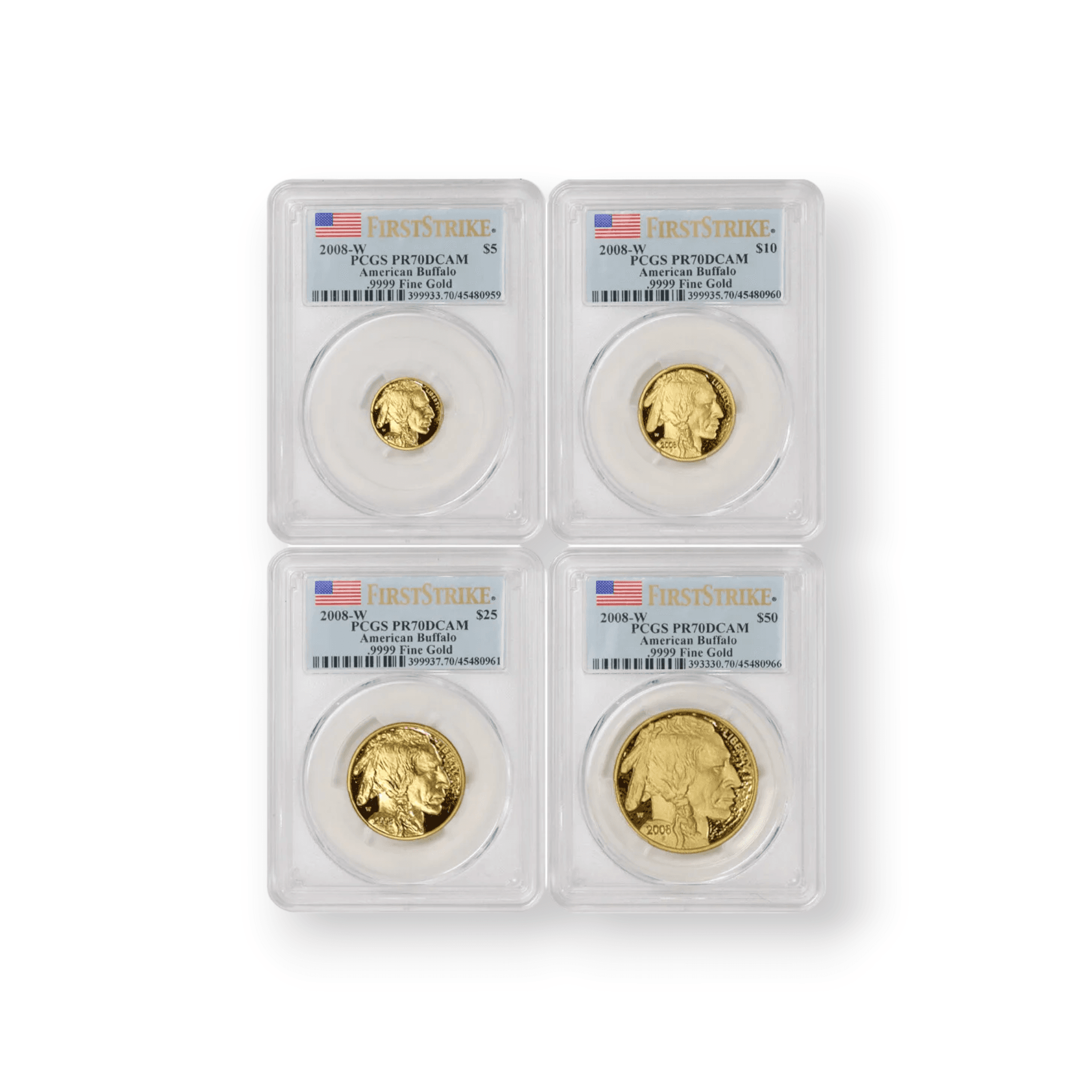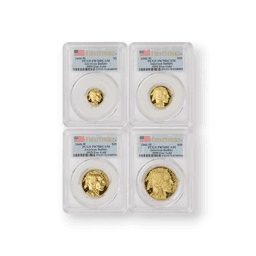 The 2008-W Proof Buffalo 4-Piece Set, PCGS Certified and crafted from .9999 fine gold, comprises an impressive array of coins from the United States Mint, each featuring the iconic American Buffalo design. This set includes four denominations: the 1 oz, 1/2 oz, 1/4 oz, and 1/10 oz gold coins, all struck at the West Point Mint, as indicated by the 'W' mint mark. The proof finish on these coins, a result of a specialized minting process, creates a stunning contrast between the frosted design and the mirrored background, emphasizing the detailed portrayal of the buffalo and the Native American profile. PCGS certification of each coin guarantees their authenticity and quality, making this set highly prized among collectors for its fine gold content, the historical significance of the Buffalo design, and the prestige of owning a complete, certified collection from a significant year in gold coinage.