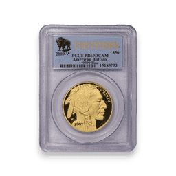 The 2009-W Proof Buffalo 1 oz $50 Gold Coin, minted in .9999 fine gold and PCGS Certified, is a notable addition to any numismatic collection. This coin proudly features the iconic Buffalo Nickel design by James Earle Fraser, which includes a detailed portrayal of an American Bison on one side and a Native American profile on the other. Struck at the West Point Mint, identified by the 'W' mintmark, it is part of the esteemed series of 24-karat gold coins from the U.S. Mint. The proof designation of this coin highlights its superior quality, with sharp, intricate details and a mirror-like background, enhancing the visual appeal of Fraser's design. The Professional Coin Grading Service (PCGS) certification ensures the coin's authenticity and mint condition. With an exact mintage of 49,388, the 2009-W Proof Buffalo Gold Coin is a relatively rare piece, making it highly prized by collectors and gold enthusiasts for its artistic design, historical significance, and the purity of its gold content. This limited mintage adds to its desirability and investment value in the numismatic market.