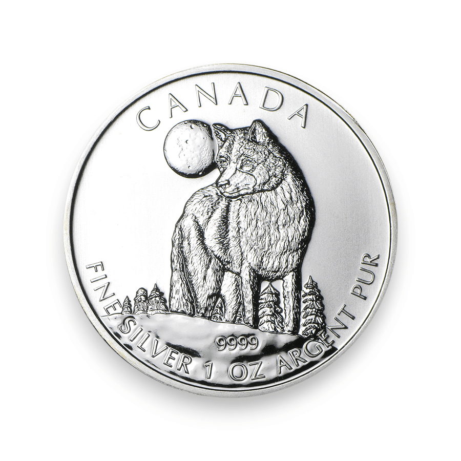The 2011 Canadian 1 oz Silver Wildlife Series Wolf coin is a standout release from the Royal Canadian Mint, featuring a .9999 fine silver purity. This coin marks one of the early entries in the celebrated Canadian Wildlife Series, which aims to highlight the rich diversity and natural beauty of Canada's wildlife. The wolf, a symbol of the untamed spirit of Canada's vast wilderness, is exquisitely captured on this coin. The design showcases a lone wolf in a detailed and lifelike pose, emphasizing the animal's wild nature and its significance within the Canadian ecosystem. Weighing 1 ounce, the coin is highly regarded by collectors and investors not only for its fine silver content but also for its artistic value and the craftsmanship of the Royal Canadian Mint. The 2011 Silver Wildlife Series Wolf coin is particularly valued for its portrayal of one of Canada's most iconic predators, making it a sought-after piece for those who appreciate wildlife-themed numismatics and the excellence of Canadian coinage.