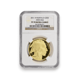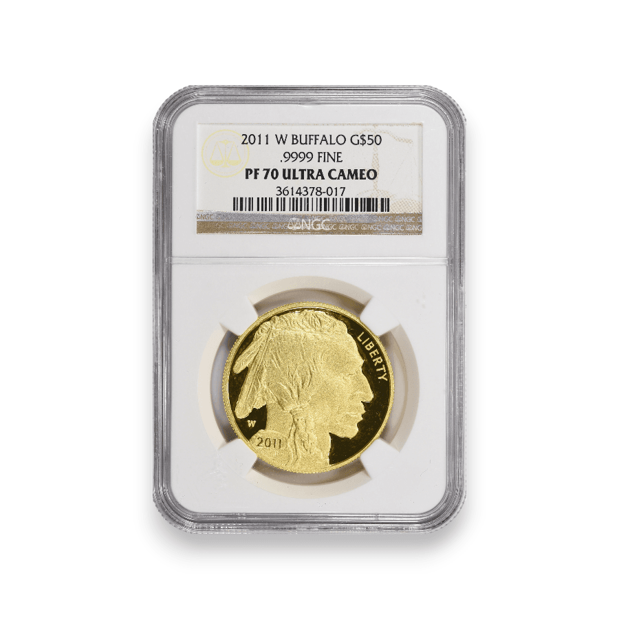 The 2011-W Proof Buffalo 1 oz $50 Gold Coin is a distinguished piece in the numismatic world, minted in .9999 fine gold. This coin features the iconic Buffalo Nickel design by James Earle Fraser, showcasing an American Bison on one side and a Native American profile on the other. Struck at the West Point Mint, indicated by the 'W' mintmark, it is part of the U.S. Mint's series of 24-karat gold coins. The proof quality of this coin, with its exceptional detail and mirror-like finish, underscores the Mint's commitment to excellence in craftsmanship. Certified by the NGC (Numismatic Guaranty Corporation), this coin's condition and authenticity are assured. The exact mintage of the 2011-W Proof Buffalo Gold Coin is 28,683, making it a relatively rare and sought-after item among collectors and investors. Its limited production, combined with its historical significance and the high purity of its gold content, enhances its appeal and value in the collector's market.