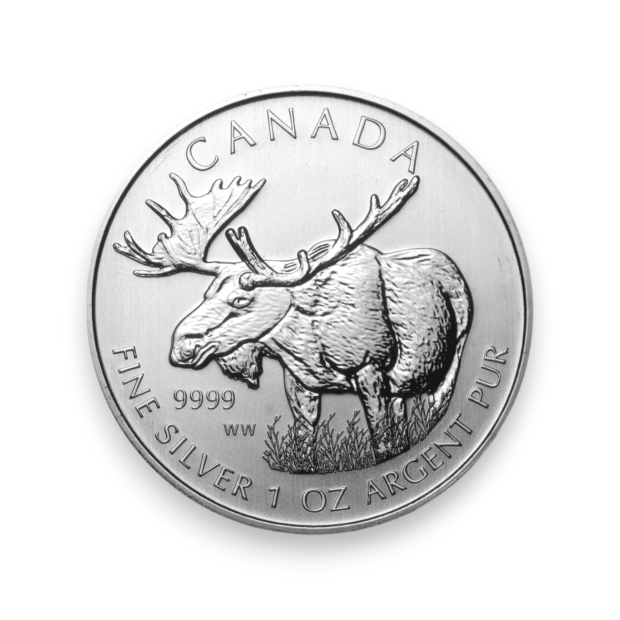 The 2012 Canada 1 oz Silver Wildlife Series Moose coin is an impressive installment in the Royal Canadian Mint's celebrated Wildlife Series, minted with a .9999 fine silver purity. This series captures the essence of Canada's diverse and majestic wildlife, and the moose edition is a tribute to one of the country's most iconic and largest land mammals. The coin features a striking depiction of a moose in its natural habitat, highlighting the animal's imposing stature and the characteristic antlers that make it instantly recognizable. Weighing 1 ounce, the coin has garnered attention from collectors and investors alike for its fine silver content, exquisite design, and the craftsmanship of the Royal Canadian Mint. The 2012 Silver Wildlife Series Moose coin is particularly valued for its portrayal of Canadian wilderness and wildlife, making it a sought-after piece for those who appreciate the intersection of numismatics and natural history.