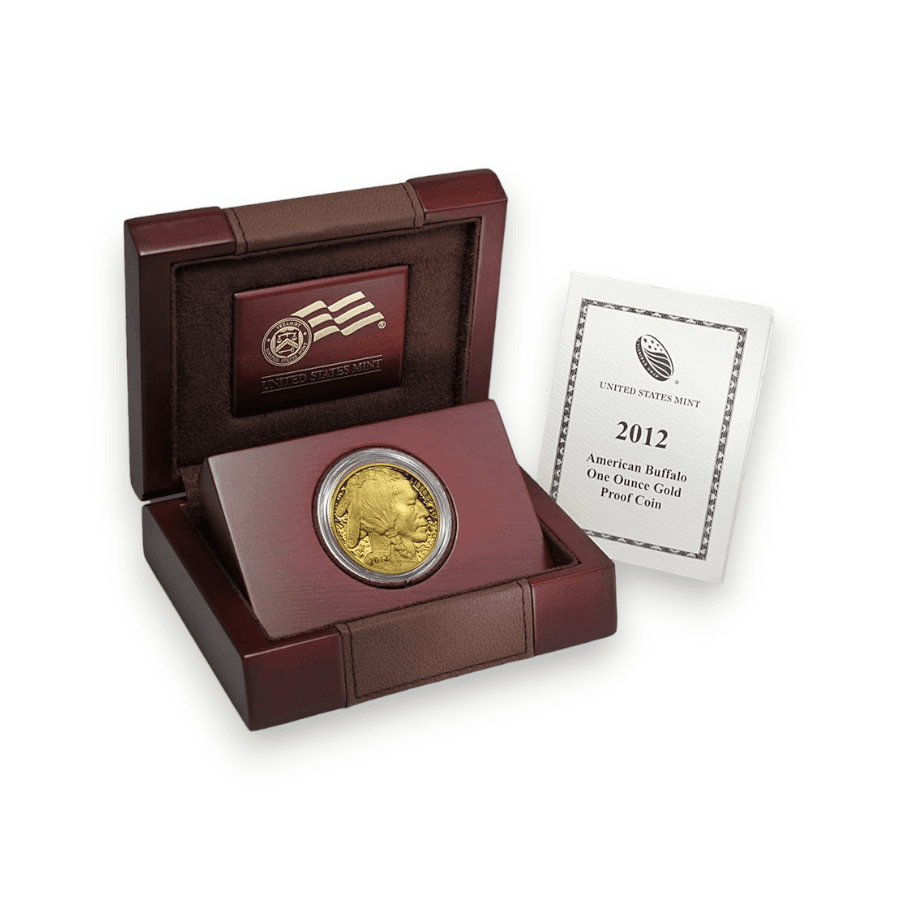 The 2012-W 1 oz Proof $50 American Gold Buffalo, minted in .9999 fine gold, is a distinguished numismatic piece with a mintage of 19,715. As a continuation of the American Gold Buffalo series introduced by the U.S. Mint in 2006, this coin signifies the seventh year of the series. It features the iconic design of James Earle Fraser from the 1913 Type I Buffalo nickel. The obverse showcases a Native American profile, while the reverse features an American buffalo, thought to be inspired by Black Diamond, a bison that lived in New York's Central Park Zoo. The proof coin is marked with a 'W' mint mark, denoting its production at the West Point Mint. It is issued with original mint packaging, including a protective box and a Certificate of Authenticity. The 2012-W Gold Buffalo is particularly valued by collectors and investors due to its fine craftsmanship, historical value, and relatively low mintage.