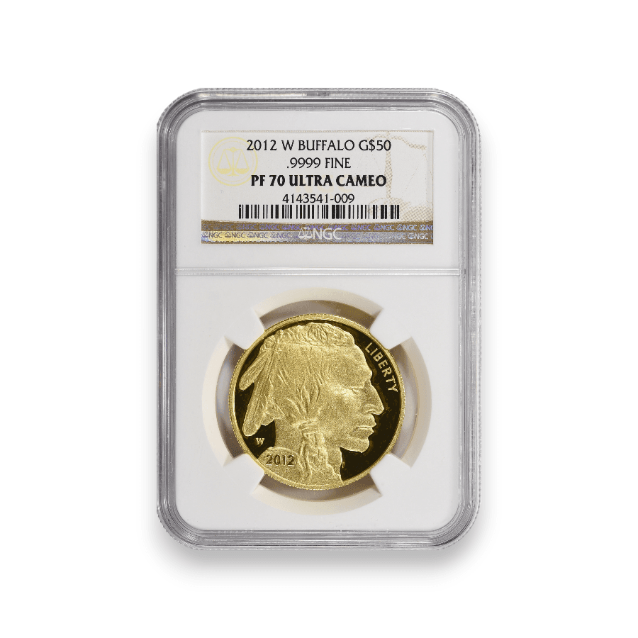The 2012-W Proof Buffalo 1 oz $50 Gold Coin, minted in .9999 fine gold and certified by NGC, is a prestigious piece in the world of numismatics. This coin showcases the classic Buffalo Nickel design by James Earle Fraser, featuring a detailed American Bison on one side and a Native American profile on the other. Struck at the West Point Mint, as indicated by the 'W' mintmark, this coin is part of the U.S. Mint's series of 24-karat gold coins. The proof designation highlights its exceptional craftsmanship, with intricate details and a mirror-like finish that enhances the beauty of Fraser's design. NGC certification guarantees the coin's authenticity and mint condition. The exact mintage of the 2012-W Proof Buffalo Gold Coin is 19,715, making it a relatively rare item, highly prized by collectors and investors for its artistic and historical significance, as well as the purity of its gold content. Its limited production, combined with these qualities, adds to its appeal and value in the numismatic market.
