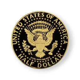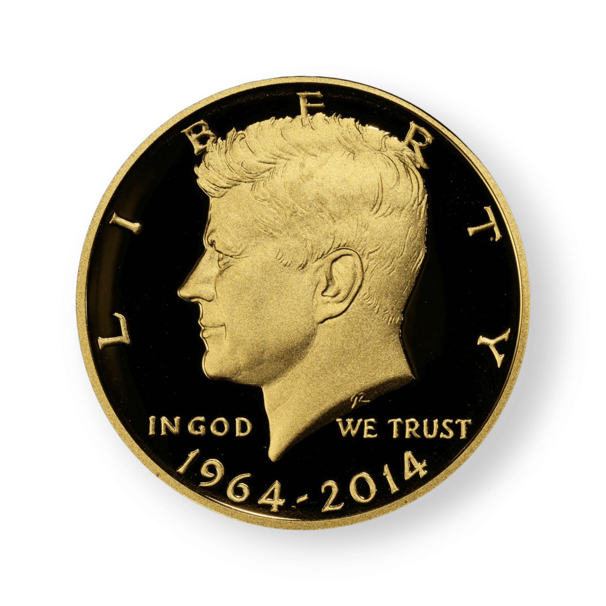 The 2014 50th Anniversary Kennedy Half Dollar Gold Proof Coin commemorates a significant milestone in American numismatic history, paying tribute to one of the nation's most iconic and beloved figures, President John F. Kennedy. Produced by the U.S. Mint to mark the 50th anniversary of the Kennedy half dollar's introduction, this exquisite coin is struck from 3/4 ounce of .9999 pure gold, offering a luxurious reinterpretation of the original design. The obverse features a detailed portrait of JFK, capturing his distinct likeness and reflecting the nation's enduring admiration for its 35th president. The reverse bears the Presidential Seal, a symbol of Kennedy's esteemed office. Its proof finish ensures a mirror-like background with frosted devices, accentuating the design's intricate details. Limited to a mintage of 73,772, this coin has become a coveted treasure among collectors. Elegantly housed in its official mint box and accompanied by a Certificate of Authenticity (COA), the 2014 50th Anniversary Kennedy Half Dollar Gold Proof Coin is a poignant tribute to Kennedy's lasting legacy and the rich tapestry of American numismatics.