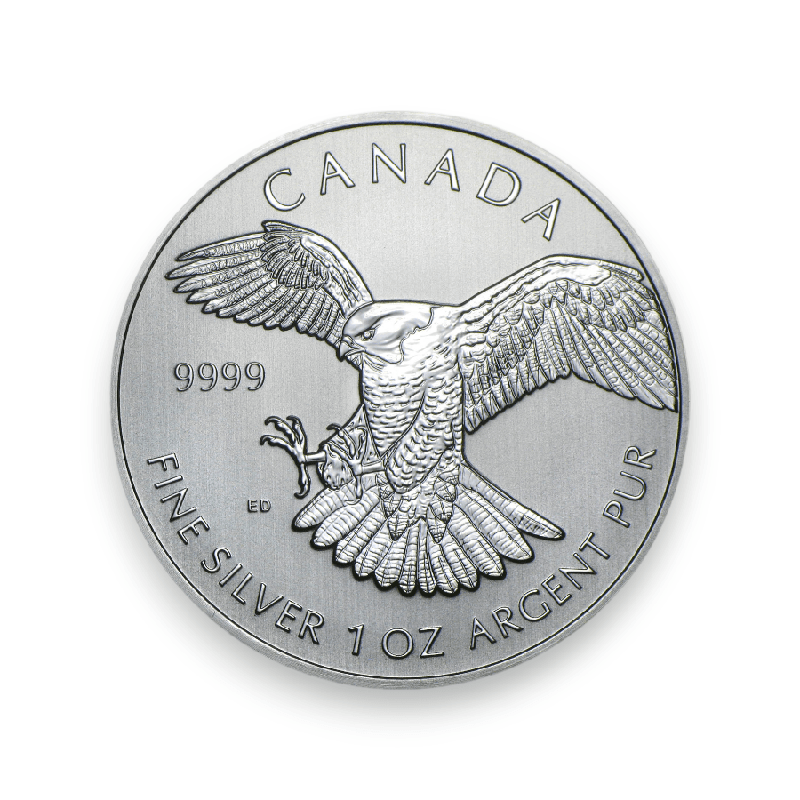 The 2014 Canadian 1 oz Silver Birds of Prey Series Peregrine Falcon coin, minted with a .9999 fine silver purity, is the inaugural release in the Royal Canadian Mint's esteemed Birds of Prey series. This series is dedicated to showcasing the majesty and prowess of Canada's predatory birds, and the Peregrine Falcon coin beautifully captures the essence of speed and precision that this bird is renowned for. The coin features a striking design of a Peregrine Falcon in the midst of a hunting dive, emphasizing the incredible speed and focus of this avian predator. The level of detail in the depiction highlights the falcon's streamlined physique and determined expression, making it a standout piece for collectors and investors alike. Weighing 1 ounce, this coin is sought after for its combination of high silver purity, exceptional craftsmanship, and the significance of its wildlife theme. The 2014 release of the Silver Birds of Prey Series Peregrine Falcon coin has become a prized addition to collections, valued for its artistic merit and the precision minting standards of the Royal Canadian Mint.