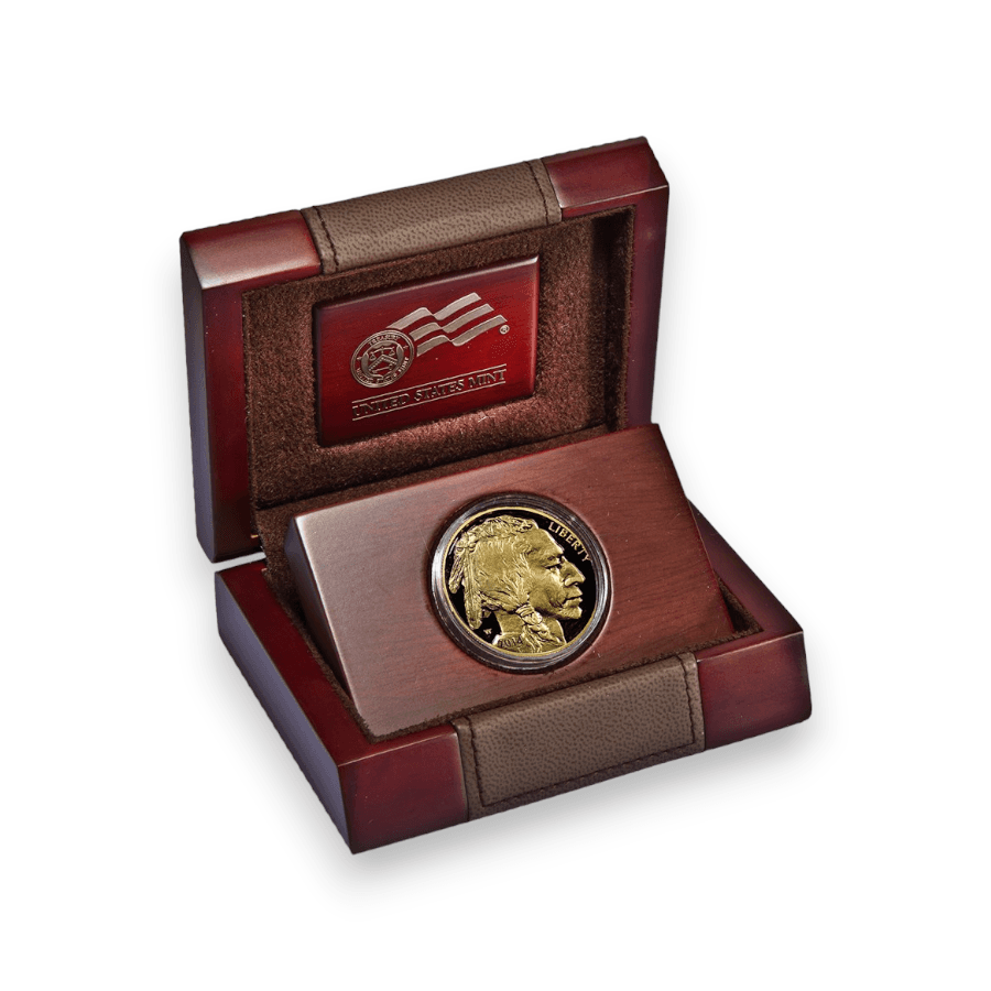 The 2014-W 1 oz Proof $50 American Gold Buffalo, made from .9999 fine gold, is a highly regarded numismatic item with a mintage of 20,557. As an integral part of the American Gold Buffalo series, it was introduced by the U.S. Mint in 2006, and the 2014 edition marks the ninth year of this series. The coin features the esteemed design by James Earle Fraser from the 1913 Type I Buffalo nickel. On the obverse, it displays a Native American profile, and on the reverse, there is an image of an American buffalo, which is thought to be modeled after Black Diamond, a bison that resided in the Central Park Zoo. This proof coin is identified by the 'W' mint mark, signifying its production at the West Point Mint, and is delivered in its original packaging, including a box and a Certificate of Authenticity. The 2014-W Gold Buffalo is in high demand among collectors and investors, prized for its fine artistry, historical resonance, and relatively limited mintage.