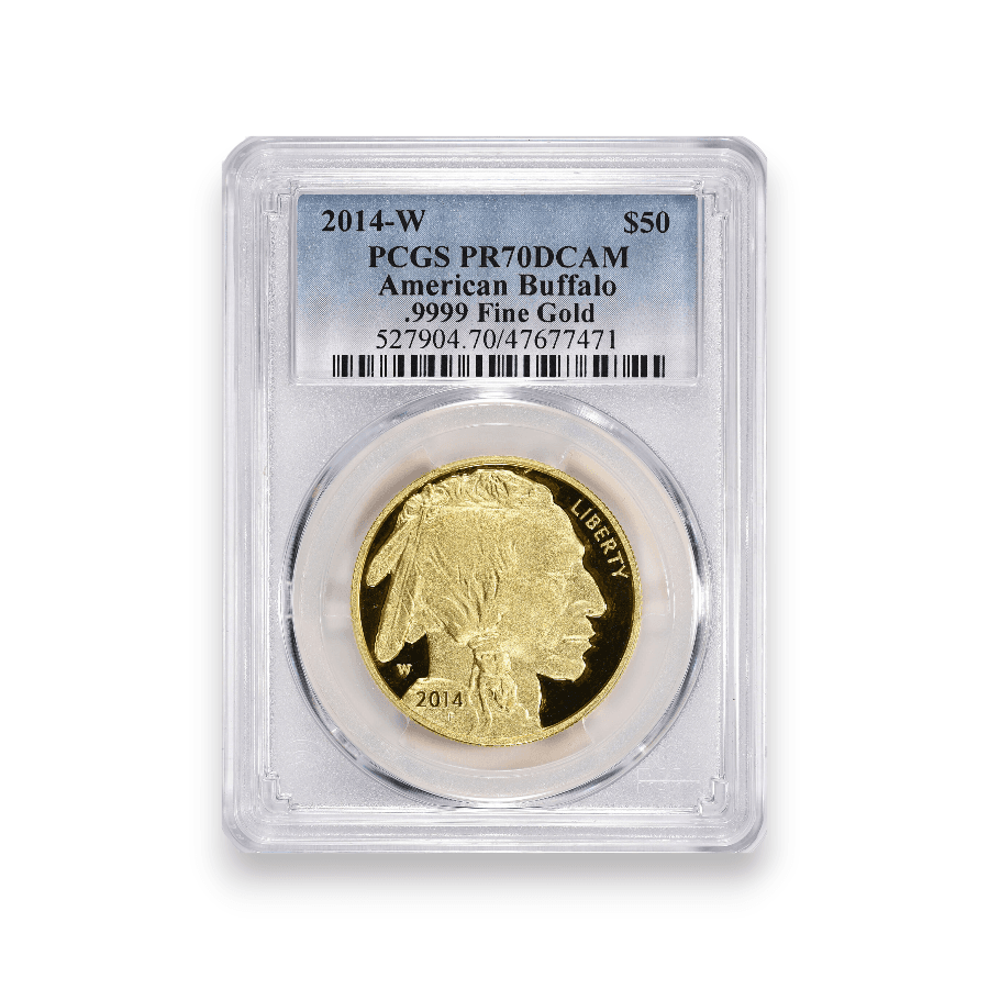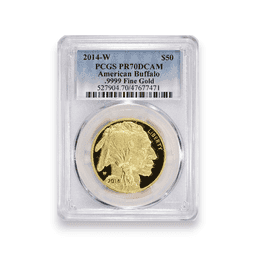 The 2014-W Proof Buffalo 1 oz $50 Gold Coin, certified by PCGS, is a remarkable addition to any coin collection, crafted in .9999 fine gold. This coin exhibits the iconic Buffalo Nickel design by James Earle Fraser, featuring an American Bison on one side and a Native American profile on the other. Struck at the West Point Mint, denoted by the 'W' mintmark, it forms an important part of the U.S. Mint's 24-karat gold coin series. The proof quality of this coin is evident in its sharp details and mirror-like finish, which highlight the beauty and intricacy of Fraser's design. The Professional Coin Grading Service (PCGS) certification affirms the coin's authenticity and mint condition. With an exact mintage of 20,557, the 2014-W Proof Buffalo Gold Coin is a relatively rare and coveted piece, highly valued by collectors and investors for its artistic merit, historical significance, and the purity of its gold content. Its limited production adds to its desirability and investment value in the numismatic market.