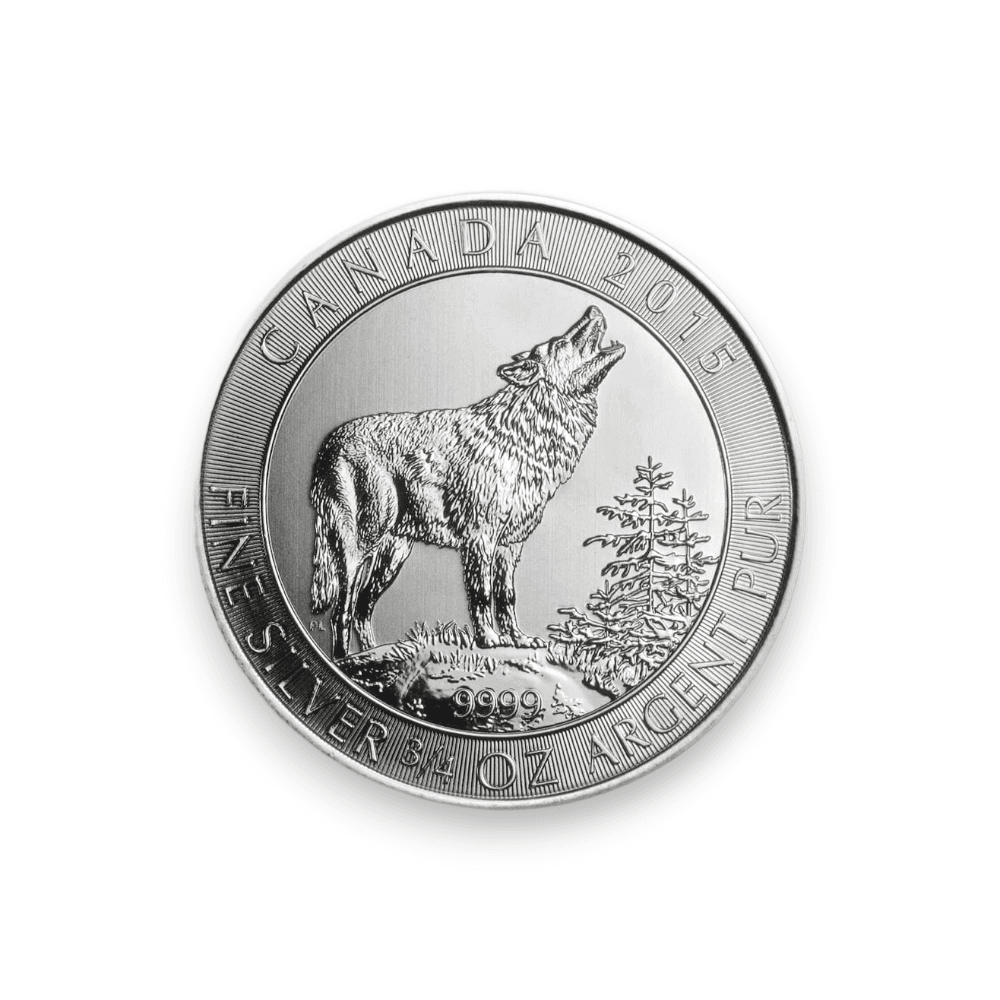 The 2015 3/4 oz Canadian Grey Wolf Silver Coin, minted with a .9999 fine silver purity, is a distinctive and highly regarded addition to the Royal Canadian Mint's offerings. This coin features the grey wolf, an iconic symbol of Canada's wilderness and a testament to the country's rich biodiversity. The coin's design masterfully captures the essence of the grey wolf, showcasing its powerful stature and keen gaze, elements that reflect the animal's status as a revered predator in the Canadian wild. Unique for its 3/4 ounce weight, this coin provides collectors and investors with an alternative option to the more common 1 oz silver coins, making it a notable piece for its silver content, exceptional craftsmanship, and the significance of its wildlife theme. The 2015 release of the Grey Wolf coin is celebrated for its artistic merit, the precision of its minting, and its contribution to highlighting Canada's natural heritage, making it a prized possession for those who value the beauty of wildlife and the quality of Canadian numismatics.