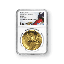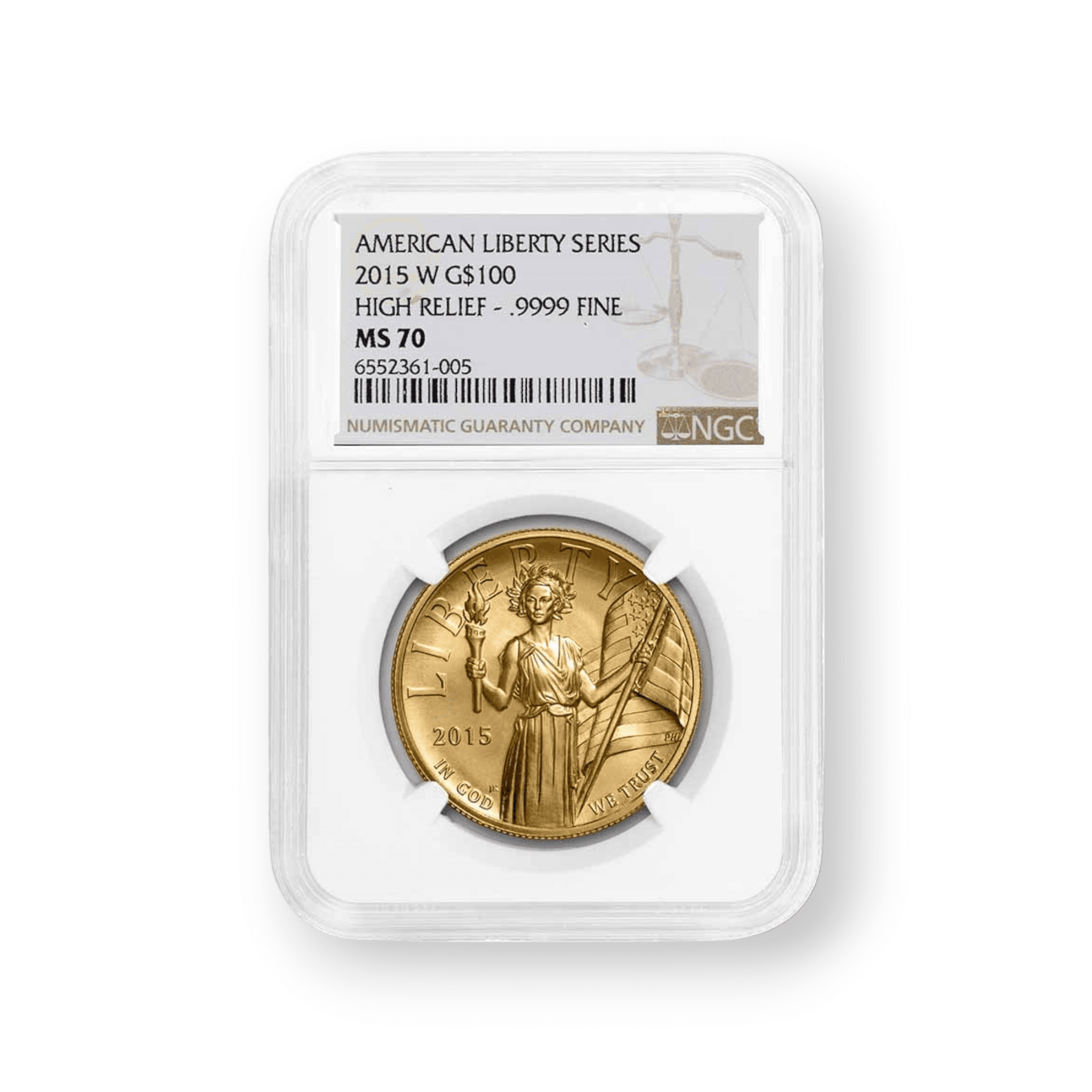 The 2015 American Liberty High Relief $100 Gold Coin NGC Certified .9999 Fine is a modern numismatic masterpiece that features a contemporary design of Lady Liberty and a boldly depicted American eagle. Certified by NGC, one of the leading third-party grading services, as MS70, the coin has achieved the highest grade for its pristine condition. The coin boasts one ounce of .9999 fine gold, symbolizing the union of historical symbolism with modern minting excellence. The high relief design of the coin is a nod to the original artistic visions for American coinage, showcasing advanced design and striking techniques. It's a coin that not only represents significant numismatic value but also the progression of coin design and technology.
