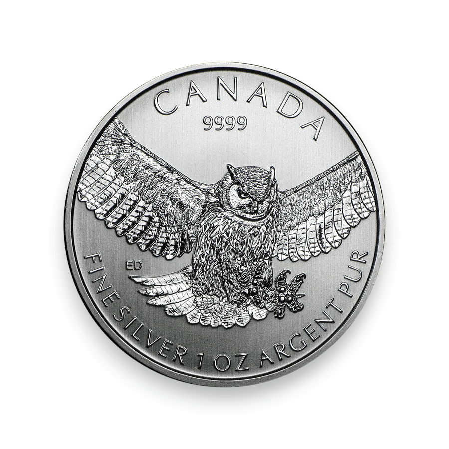 The 2015 Canadian 1 oz Silver Birds of Prey Series Great Horned Owl coin is a distinguished piece from the Royal Canadian Mint, known for its .9999 fine silver purity and exquisite craftsmanship. This coin, part of the Birds of Prey series, celebrates the great horned owl, a symbol of strength and wisdom in the vast Canadian wilderness. The coin features a beautifully detailed depiction of the great horned owl in flight, showcasing its powerful wings and intense gaze, characteristics that highlight the owl's predatory prowess. Weighing 1 ounce, it is highly valued by collectors and investors for both its precious metal content and its artistic value. The Birds of Prey series has been widely acclaimed for highlighting Canada's native birds of prey in stunning detail, and the Great Horned Owl coin, with its intricate design and fine silver purity, continues this tradition of excellence. This 2015 release has become a sought-after collectible for those who appreciate the beauty of wildlife and the quality of Canadian minting.