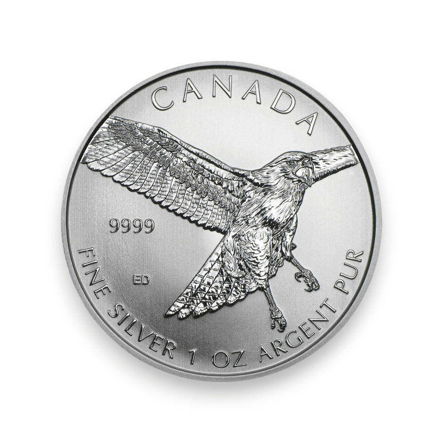 The 2015 Canadian 1 oz Silver Birds of Prey Series Red-Tailed Hawk coin, minted with a .9999 fine silver purity, is a distinguished release from the Royal Canadian Mint. This coin is part of the Birds of Prey series, which celebrates the power and beauty of Canada's avian predators. The Red-Tailed Hawk edition features an intricately detailed design of the red-tailed hawk in mid-flight, showcasing its impressive wingspan and keen eyesight, attributes that make this bird a formidable predator in the wild. Weighing 1 ounce, this coin is highly valued by collectors and investors for its silver content, exquisite design, and the craftsmanship of the Royal Canadian Mint. The Birds of Prey series has been lauded for highlighting the majesty of Canada's birds of prey with remarkable precision and artistry, making the 2015 Red-Tailed Hawk coin a sought-after piece for those who appreciate wildlife-themed numismatics and high-quality silver coinage.