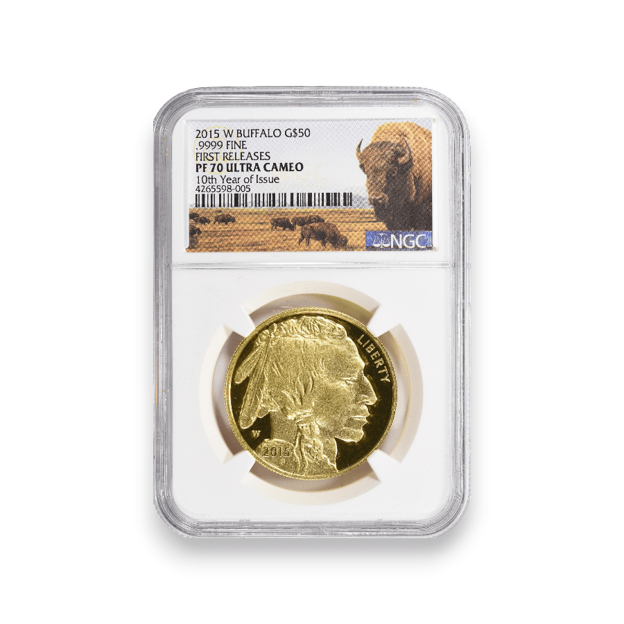 The 2015-W Proof Buffalo 1 oz $50 Gold Coin, minted in .9999 fine gold and certified by NGC, is a notable treasure in the world of numismatics. This coin continues the tradition of the Buffalo Nickel design, created by James Earle Fraser, with a depiction of an American Bison on one side and a Native American profile on the other. Struck at the West Point Mint, as indicated by the 'W' mintmark, it is part of the United States Mint's series of 24-karat gold coins. The coin's proof quality, characterized by sharp detail and a brilliant, mirror-like finish, showcases the Mint's exceptional craftsmanship. NGC certification ensures the coin's authenticity and pristine condition. The exact mintage of the 2015-W Proof Buffalo Gold Coin is 16,591, making it a relatively scarce and sought-after item for collectors and gold enthusiasts. Its limited production, combined with its historical and artistic significance, as well as the high purity of its gold content, enhances its value and appeal in the collector's market.