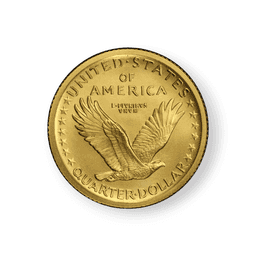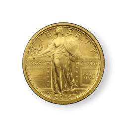 The 2016-W 1/4 oz Gold Standing Liberty Quarter Centennial Coin celebrates a monumental chapter in U.S. coinage, marking the 100th anniversary of Hermon A. MacNeil's classic Standing Liberty Quarter design. Precision-minted at the esteemed West Point Mint, bearing its 'W' mintmark, this special coin boasts 1/4 ounce of .9999 fine gold. The coin's obverse resuscitates MacNeil's elegant portrayal of Lady Liberty in stride, holding her shield of defense in one hand and an olive branch of peace in the other, a design evoking the nation's aspirations during a tumultuous era. The reverse proudly displays a majestic eagle in mid-flight, a nod to America's indomitable spirit. Enhanced by a proof finish, the coin exhibits a captivating contrast between its frosted devices and mirror-like background. With a mintage capped at a distinctive 100,000, this coin is a treasure for both its historical resonance and numismatic value. Each coin is meticulously presented in its original mint packaging, accompanied by a Certificate of Authenticity (COA), solidifying its place as a collector's gem and a tribute to a century of American artistry in coinage.