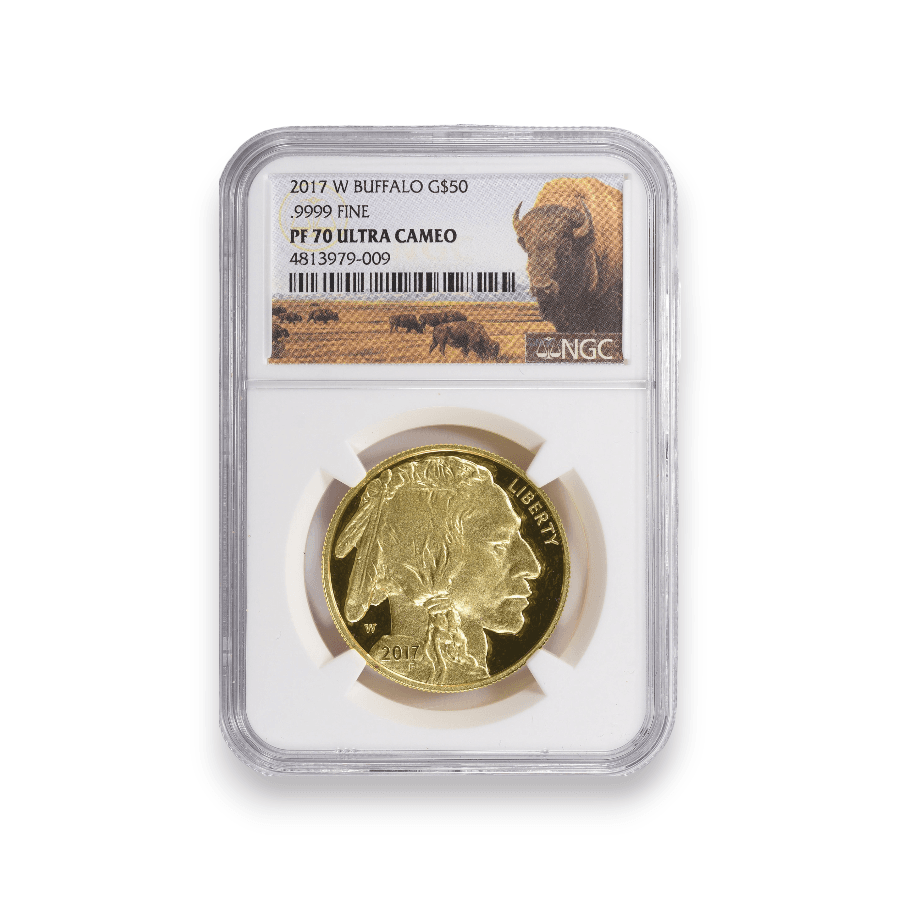 The 2017-W Proof Buffalo 1 oz $50 Gold Coin, minted in .9999 fine gold and certified by NGC, is a prestigious addition to any coin collection. This coin features the esteemed Buffalo Nickel design by James Earle Fraser, with an American Bison on one side and a Native American profile on the other. Produced at the West Point Mint, denoted by the 'W' mintmark, it is a part of the U.S. Mint's series of 24-karat gold coins. The proof quality of the coin, characterized by its exceptional detail and mirror-like finish, showcases the mint's high standards of craftsmanship. NGC certification ensures the coin's authenticity and mint condition. The exact mintage of the 2017-W Proof Buffalo Gold Coin is 15,810, making it a relatively scarce and desirable item for collectors and investors. Its limited production, combined with its historical significance and the high purity of its gold content, contributes to its appeal and value in the numismatic market.