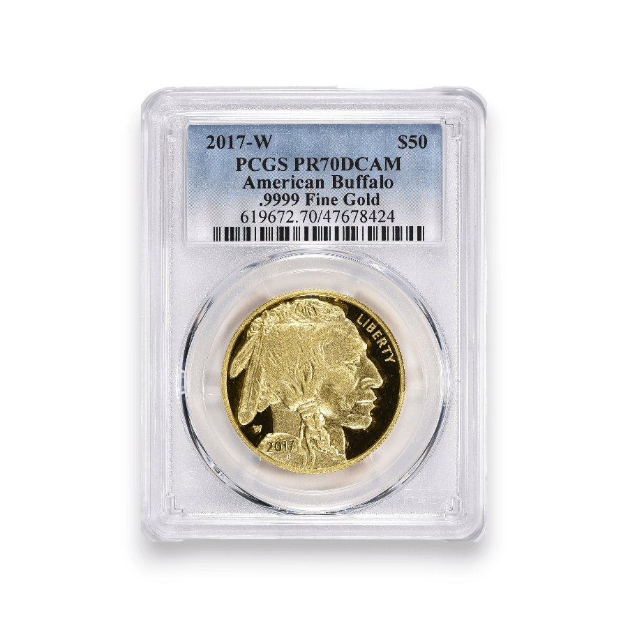 The 2017-W Proof Buffalo 1 oz $50 Gold Coin, certified by PCGS, is a distinguished piece in the field of numismatics, crafted from .9999 fine gold. This coin features the iconic Buffalo Nickel design by James Earle Fraser, portraying an American Bison on one side and a Native American profile on the other. Minted at the West Point Mint, indicated by the 'W' mintmark, it forms an integral part of the U.S. Mint's series of 24-karat gold coins. The proof quality of the coin is marked by its sharp detail and a brilliant, mirror-like finish, emphasizing the artistic excellence of the design. The Professional Coin Grading Service (PCGS) certification guarantees the coin's authenticity and condition. With an exact mintage of 15,810, the 2017-W Proof Buffalo Gold Coin is a relatively rare and sought-after item, highly prized by collectors and investors for its artistic merit, historical significance, and the purity of its gold content. Its limited production enhances its desirability and investment value in the numismatic market.