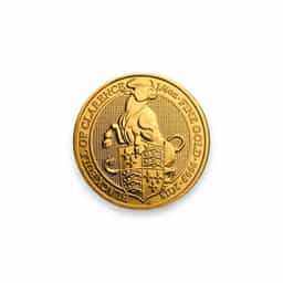 The 2018 1/4 oz Gold Great Britain Queen's Beast Bull coin is a distinguished addition to the Royal Mint's acclaimed Queen's Beasts series, featuring a .9999 fine gold purity. This series, inspired by the heraldic beasts that stood at the coronation of Queen Elizabeth II, explores the rich tapestry of the British monarchy's history and symbolism. The Black Bull of Clarence, highlighted in this issue, represents power, strength, and the royal lineage of the House of York. The coin's design masterfully showcases the Black Bull in a powerful stance, accompanied by a shield emblazoned with the arms of the House of York, capturing the essence of heraldic tradition and royal heritage. Weighing 1/4 ounce, the gold coin not only offers a significant investment in fine gold but also serves as a piece of numismatic art, celebrating the legacy and symbolism of one of England's most historic royal houses. The Queen's Beasts series has been celebrated for its exceptional craftsmanship and intricate designs, making the 2018 Gold Bull a sought-after piece for collectors and investors alike, eager to own a part of this prestigious collection that melds historical significance with the intrinsic value of gold.