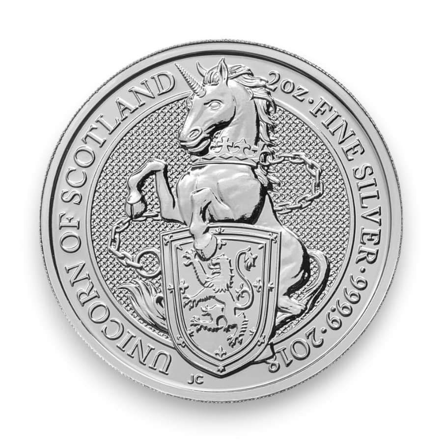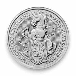 The 2018 2 oz Silver Great Britain Queen's Beast Unicorn coin is a standout release in the Royal Mint's prestigious Queen's Beasts series, crafted with a .9999 fine silver purity. This series celebrates the ten heraldic beasts that stood at the coronation of Queen Elizabeth II, each symbolizing different parts of her royal heritage. The Unicorn of Scotland, featured in this edition, represents purity, innocence, and power in heraldry, and is one of Scotland's most enduring national symbols. The coin's design beautifully captures the majestic stance of the Unicorn, chained to a shield bearing the historic Scottish arms, embodying the animal's strength and the nation's rich history. Weighing 2 ounces, the Unicorn coin offers a significant investment in fine silver, along with the artistry and historical depth that the Queen's Beasts series is known for. The series has been widely acclaimed for its high-quality minting, intricate designs, and deep cultural significance, making the 2018 Unicorn of Scotland coin a sought-after piece for collectors and investors who appreciate the fusion of numismatic craftsmanship with legendary symbolism.