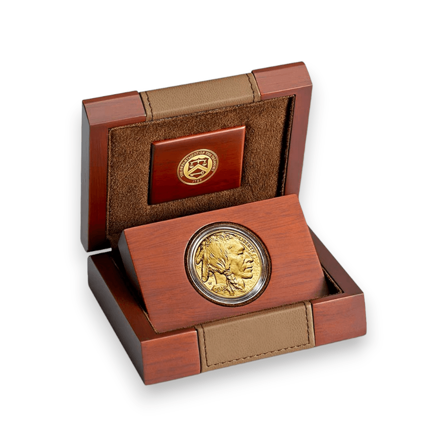 The 2018-W 1 oz Proof $50 American Gold Buffalo, minted in .9999 fine gold, is a distinguished coin in the numismatic community with a mintage of 15,500. This coin is an integral part of the American Gold Buffalo series, launched by the U.S. Mint in 2006, representing the thirteenth year of the series. It upholds the celebrated design by James Earle Fraser from the 1913 Type I Buffalo nickel, featuring the obverse with a Native American profile and the reverse depicting an American buffalo, believed to be based on Black Diamond, a bison that was housed in the Central Park Zoo. The proof coin, identifiable by the 'W' mint mark from the West Point Mint, is offered in its original mint packaging, including a box and a Certificate of Authenticity. The 2018-W Gold Buffalo is particularly valued by collectors and investors for its artistic design, historical roots, and its limited mintage.