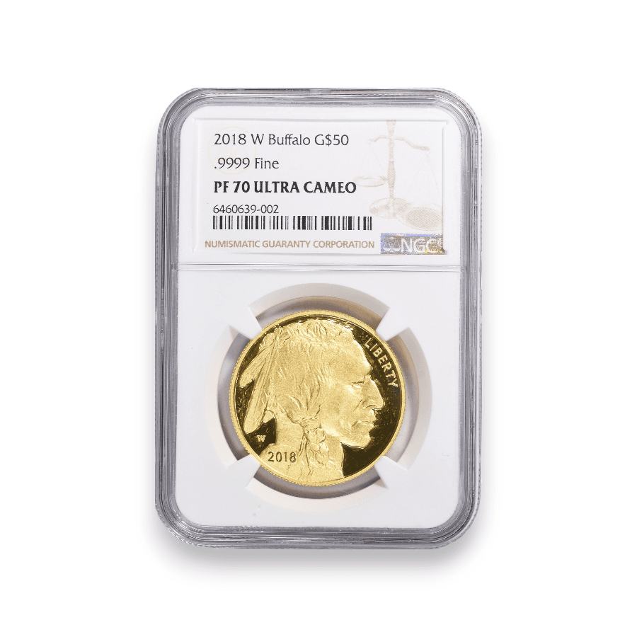 The 2018-W Proof Buffalo 1 oz $50 Gold Coin, minted in .9999 fine gold and certified by NGC, is a coveted piece in the world of coin collecting. This exquisite coin features the renowned Buffalo Nickel design by James Earle Fraser, which includes a depiction of an American Bison on one side and a Native American profile on the other. Struck at the West Point Mint, as indicated by the 'W' mintmark, this coin is part of the U.S. Mint's series of 24-karat gold coins. The proof quality of the coin, with its sharp detail and mirror-like finish, highlights the mint's commitment to precision and artistry. The NGC certification ensures the coin's authenticity and pristine condition. The exact mintage of the 2018-W Proof Buffalo Gold Coin is 15,810, making it a relatively scarce and sought-after item among collectors and investors. Its limited production, combined with its historical significance and the high purity of its gold content, enhances its appeal and value in the numismatic market.