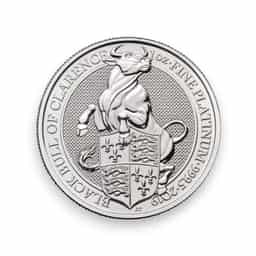 The 2019 1 oz Platinum Great Britain Queen's Beast Black Bull Coin is a distinguished addition to the celebrated Queen's Beast series, minted in .9995 fine platinum. This coin honors the heraldic creatures that stood guard during Queen Elizabeth II's coronation. The obverse features the fifth definitive portrait of Queen Elizabeth II by Jody Clark, along with the coin's legal tender value of £100. The reverse side of the coin showcases the formidable Black Bull of Clarence, a symbol of strength and power, with intricate detailing that brings the beast to life. Weighing 1 oz, the coin contains approximately 31.1035 grams of pure platinum. The high purity and limited mintage enhance its appeal to both collectors and investors. The 2019 1 oz Platinum Queen's Beast Black Bull Coin is a valuable addition to any collection, celebrated for its historical significance, exquisite artistry, and investment potential in platinum.