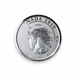 The 2019 3/4 oz Wild Horse Canadian Reverse Proof .9999 Fine Silver $2 Coin is a stunning numismatic piece issued by the Royal Canadian Mint. Crafted from 99.99% pure silver, this coin boasts a reverse proof finish, which creates a mesmerizing contrast between the frosted design elements and the mirror-like background. The coin's design features a powerful depiction of a wild horse in motion, capturing the majestic beauty and strength of these noble creatures. With a weight of 3/4 ounces and a face value of $2 CAD, this coin is not only a work of art but also a legal tender in Canada, making it a highly sought-after addition to any coin collection or investment portfolio.