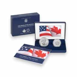 The 2019 Pride of Two Nations 2 Coin Set is a unique collaboration between the United States Mint and the Royal Canadian Mint, celebrating the strong bond and shared values between the two nations. This limited-edition set features two iconic silver coins: the American Silver Eagle and the Canadian Silver Maple Leaf, both struck in .999 fine silver. The American Silver Eagle showcases the classic Walking Liberty design on the obverse and the heraldic eagle on the reverse, while the Canadian Silver Maple Leaf displays the distinctive maple leaf design on the reverse and the effigy of Queen Elizabeth II on the obverse. Each set is presented in a beautifully crafted box with a Certificate of Authenticity (COA), making it a perfect addition to any collection or a thoughtful gift for coin enthusiasts. The mintage for this exclusive set is strictly limited to only 110,000 units, ensuring its rarity and collectibility.