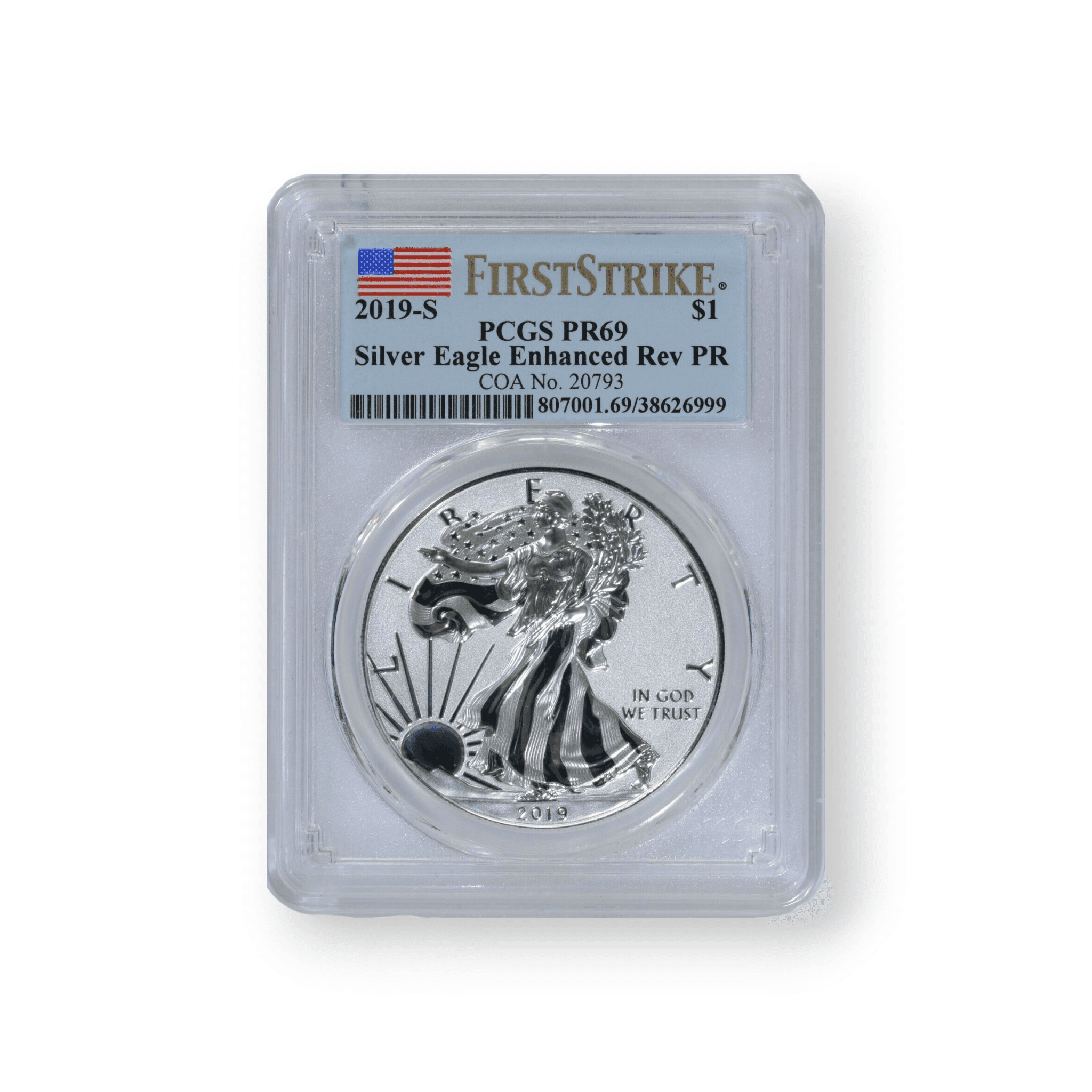 The 2019-S Enhanced Reverse Proof Silver Eagle is a notable release from the U.S. Mint for its unique aesthetic qualities and collectibility. Certified by PCGS, it is composed of .999 fine silver and was released with a limited mintage of 30,000 pieces, which at the time made it the lowest mintage Silver Eagle. The 'Enhanced Reverse Proof' designation signifies a special finish that gives the coin a distinctive look, with a frosted background and a mirror-like finish on the design elements, creating a high level of detail and contrast. This specific release is highly sought after by collectors due to its rarity and the exceptional quality confirmed by its PCGS certification. The coin’s design follows the classic Silver Eagle imagery with Liberty striding forward on the obverse and an eagle on the reverse, but the enhanced reverse proof finish adds a level of depth and nuance to the design that is not found in the standard proof or bullion versions.