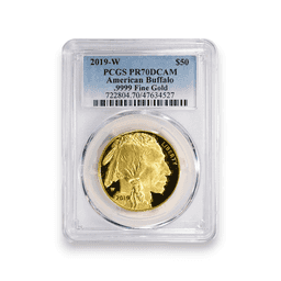The 2019-W Proof Buffalo 1 oz $50 Gold Coin, certified by PCGS, is a highly esteemed collectible, crafted in .9999 fine gold. This coin showcases the revered Buffalo Nickel design by James Earle Fraser, featuring an American Bison on one side and a Native American profile on the other. Struck at the West Point Mint, as indicated by the 'W' mintmark, it forms an integral part of the U.S. Mint's series of 24-karat gold coins. The proof quality of the coin is marked by its intricate detail and a brilliant, mirror-like finish, emphasizing the artistic excellence of Fraser's design. The Professional Coin Grading Service (PCGS) certification guarantees the coin's authenticity and condition. With an exact mintage of 16,892, the 2019-W Proof Buffalo Gold Coin is relatively rare, making it highly sought after by collectors and investors for its artistic merit, historical significance, and the purity of its gold content. This limited mintage enhances its desirability and investment value in the numismatic market.