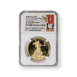 The 2020-W V75 American Gold Eagle Privy $50 Coin, with its NGC certification, represents a fusion of numismatic art and historical commemoration, featuring the distinctive 'V75' privy mark that honors the 75th anniversary of the end of World War II. This coin is part of an extremely limited issue, with only 1,945 coins struck, a number that reflects the year 1945 and imbues each piece with historical and collectible significance. Struck at the West Point Mint from .9999 fine gold, the coin is verified by NGC for its quality and condition, ensuring its place as a treasured keepsake for collectors. Beyond its metal value, the coin's design and limited mintage underscore its potential as an investment and a symbolic heirloom that commemorates a pivotal moment in world history.