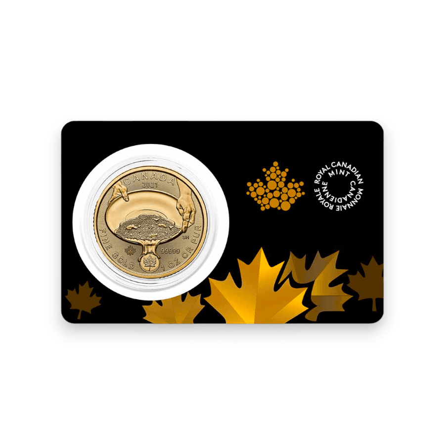 The 2021 1 oz Gold Canadian Klondike Panning coin, a standout release from the Royal Canadian Mint with an extraordinary .99999 fine purity, is encapsulated in an assay card. This coin, containing one ounce of 99.999% pure gold, commemorates the historic Klondike Gold Rush, a pivotal event in Canadian history. The design of the coin skillfully features a gold miner engaged in panning, vividly capturing the spirit and challenges of the gold rush era. This image not only represents the hard work and determination of the prospectors but also serves as a tribute to their significant role in shaping Canada's history. Each coin is securely sealed in a tamper-evident assay card, providing authenticity and quality assurance, including essential details like the coin's weight, its exceptional purity, and a unique serial number. The 2021 1 oz Gold Canadian Klondike Panning coin, celebrated for its intricate design, unparalleled purity, and the prestige of the Royal Canadian Mint, is a prized addition to collections focusing on historical significance and the highest standards of gold coinage.