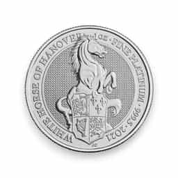 The 2021 1 oz Platinum Great Britain Queen's Beast White Horse Coin is an exquisite piece from the celebrated Queen's Beast series, minted in .9995 fine platinum. This coin commemorates the heraldic creatures that guarded Queen Elizabeth II's coronation. The obverse features the fifth definitive portrait of Queen Elizabeth II, designed by Jody Clark, along with the coin's legal tender value of £100. The reverse side of the coin showcases the elegant White Horse of Hanover, symbolizing loyalty and nobility, with intricate detailing that captures the strength and grace of this heraldic beast. Weighing 1 oz, the coin contains approximately 31.1035 grams of pure platinum. Its high purity and limited mintage make it a highly sought-after item for collectors and investors. The 2021 1 oz Platinum Queen's Beast White Horse Coin combines historical significance, artistic excellence, and investment value, making it a prized addition to any numismatic collection.