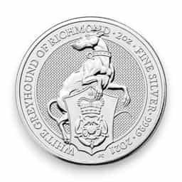 The 2021 2 oz Silver Great Britain Queen's Beast Greyhound coin, the final release in the Royal Mint's esteemed Queen's Beasts series, boasts a .9999 fine silver purity, celebrating the heraldic and royal traditions of the British monarchy. Symbolizing loyalty and the noble heritage of the Tudor dynasty, the Greyhound of Richmond is elegantly depicted alongside the Tudor coat of arms, reflecting the series' commitment to capturing the essence of each beast's historical and symbolic significance. This 2-ounce silver coin not only represents a substantial investment in fine silver but also embodies the artistry, craftsmanship, and rich narrative that have defined the Queen's Beasts series. Collectors and investors alike treasure the Greyhound coin for its intricate design, historical resonance, and the completion it marks within this celebrated collection, making it a prized acquisition for those seeking to own a piece of British heritage and numismatic excellence.