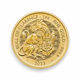 The 2023 1 oz Great Britain Tudor Beast Bull of Clarence .9999 Fine Gold £100 Coin is a distinguished piece from the Royal Mint's Tudor Beasts series, which brings to life the heraldic statues that stood guard at the coronation of Henry VIII. This series explores the rich tapestry of British heraldry, and the Bull of Clarence, a symbol of power, strength, and the royal lineage of the House of York, is prominently featured in this edition. Crafted from .9999 fine gold, this 1 oz coin showcases the majestic Bull of Clarence in exquisite detail, capturing its heraldic importance and the deep historical roots it shares with English royalty. The obverse presents the effigy of Queen Elizabeth II, affirming the coin's legal tender status with a denomination of £100. The release of the Bull of Clarence coin is eagerly anticipated by collectors and investors alike, not only for its investment-grade gold content but also for its contribution to the numismatic celebration of England's royal heritage. The 2023 Gold Bull of Clarence coin stands as a testament to the Royal Mint's unparalleled craftsmanship and dedication to preserving the legacy of Britain's past through the art of coinage, making it a coveted addition to any collection or investment portfolio.