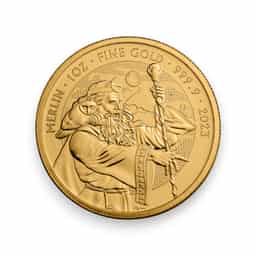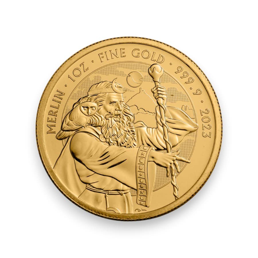 The 2023 Great Britain 1 oz Gold Merlin Myths & Legends £100 Coin is a captivating addition to the Royal Mint's esteemed Myths & Legends series, showcasing the enigmatic figure of Merlin, the legendary wizard of Arthurian lore. Struck in .9999 fine gold, this coin is both an investor's treasure and a collector's dream, merging the intrinsic value of precious metal with the rich tapestry of British mythology. The coin's design masterfully captures Merlin, symbolizing his wisdom, magic, and pivotal role in the tales of King Arthur and the Knights of the Round Table. The obverse features the effigy of Queen Elizabeth II, denoting its legal tender status with a face value of £100. This release not only appeals to those with an affinity for gold investment but also resonates with enthusiasts of legendary tales and British heritage, making the Gold Merlin coin a sought-after piece for its historical and cultural significance, as well as its numismatic artistry.