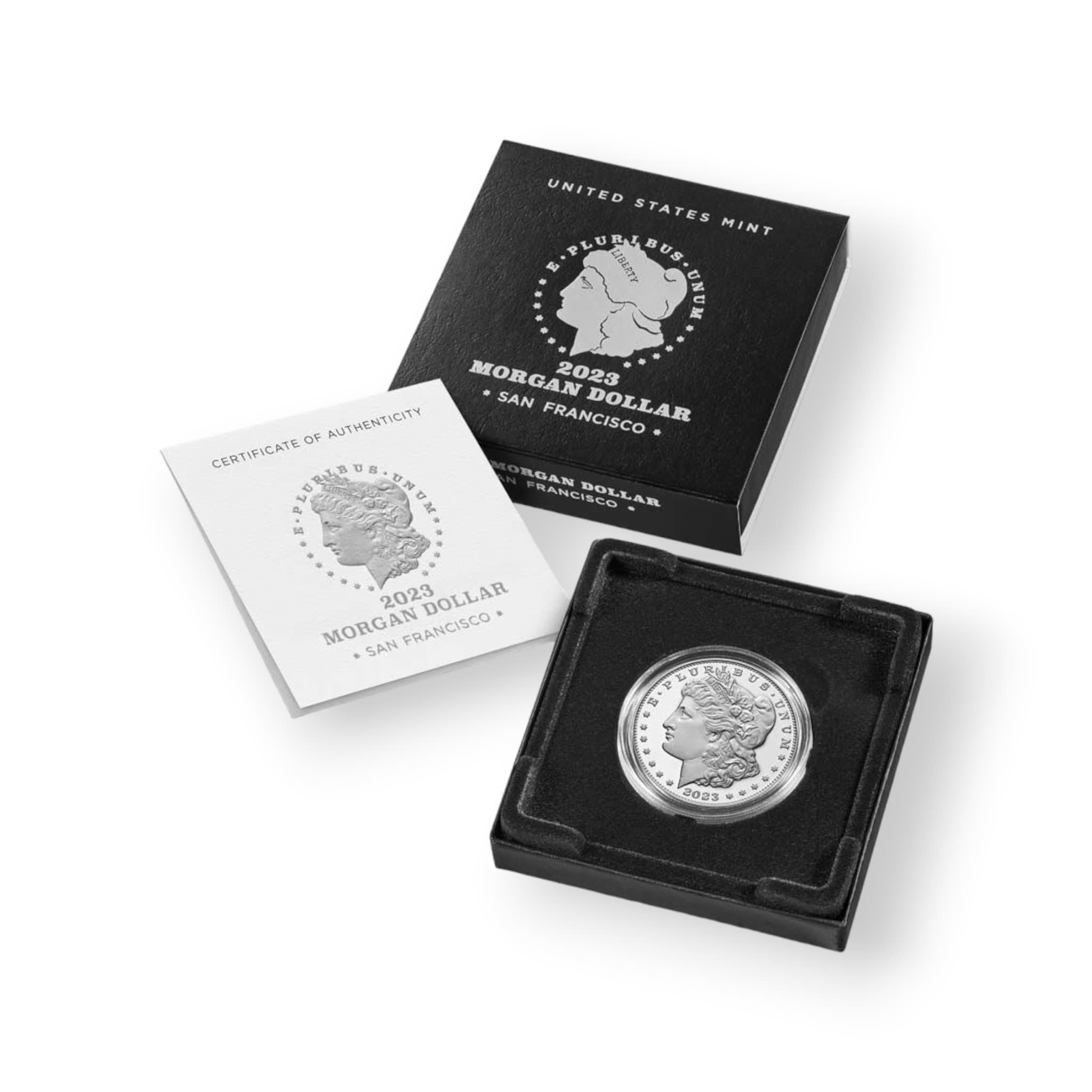 The 2023 Morgan Proof Silver Dollar (23XF) is a highly anticipated release from the United States Mint, paying homage to the iconic Morgan Dollar design first introduced in 1878. Struck in 99.9% pure silver, this proof coin showcases the exquisite craftsmanship and attention to detail that collectors have come to expect from the U.S. Mint. The obverse features a classic portrait of Lady Liberty, while the reverse depicts an eagle with outstretched wings, surrounded by a wreath. Each coin is meticulously crafted to exhibit mirror-like fields and frosted designs, creating a stunning contrast that highlights the intricate details of the Morgan Dollar. Packaged in a protective capsule and accompanied by a Certificate of Authenticity, the 2023 Morgan Proof Silver Dollar is a must-have for collectors and enthusiasts alike, offering a tangible connection to America's numismatic heritage.