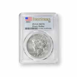 The 2023 Peace Dollar, PCGS Certified (23XH), is a meticulously crafted coin that honors the legacy of the original Peace Dollar, first minted in 1921. Struck in 99.9% fine silver and weighing 0.859 troy ounces (approximately 26.73 grams), this coin features the iconic design by Anthony de Francisci. The obverse presents a striking profile of Lady Liberty, adorned with a radiant crown, symbolizing peace and hope. The reverse showcases a majestic eagle perched on a rock, clutching an olive branch, with the word "PEACE" inscribed below. Certified by the Professional Coin Grading Service (PCGS), this coin's authenticity, quality, and condition are assured, adding significant value and confidence for collectors and investors. The 2023 Peace Dollar combines historical significance with modern minting excellence, making it a prized addition to any numismatic collection or investment portfolio.