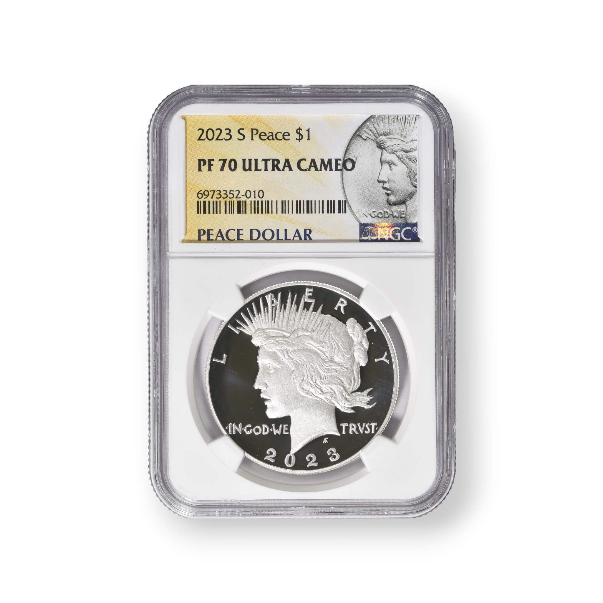 The 2023 Proof Peace Dollar is a modern reissue of the iconic American coin, struck in .999 fine silver and weighing 1 troy ounce (approximately 31.1035 grams). Featuring the classic design by Anthony de Francisci, the obverse showcases Lady Liberty with a radiant crown, while the reverse depicts a serene bald eagle clutching an olive branch. This coin is certified by the Numismatic Guaranty Corporation (NGC) under the certification number 23XL, guaranteeing its authenticity and pristine condition. The proof finish accentuates its intricate details with a mirror-like surface, making it a standout piece for collectors. Combining historical significance with modern minting excellence, the 2023 Proof Peace Dollar is a valuable addition to any numismatic collection or investment portfolio.