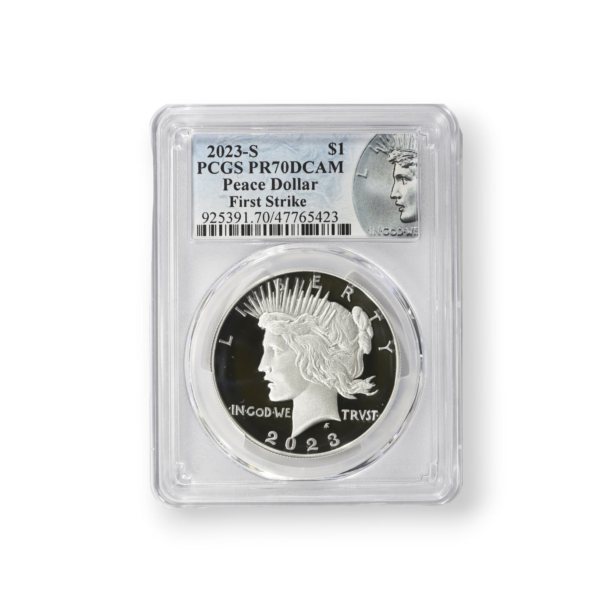 The 2023 Proof Peace Dollar, PCGS Certified (23XL), is an exquisite collectible coin that honors the legacy of the original Peace Dollar, first issued in 1921. Struck in 99.9% fine silver and weighing 0.859 troy ounces (approximately 26.73 grams), this proof coin features the iconic design by Anthony de Francisci with exceptional detail and a mirror-like finish. The obverse presents a striking profile of Lady Liberty, adorned with a radiant crown, symbolizing peace and hope. The reverse showcases a majestic eagle perched on a rock, clutching an olive branch, with the word "PEACE" inscribed below. Certified by the Professional Coin Grading Service (PCGS), this coin's authenticity, quality, and condition are assured, adding significant value and confidence for collectors and investors. The 2023 Proof Peace Dollar combines historical significance with modern minting excellence and proof quality, making it a prized addition to any numismatic collection or investment portfolio.