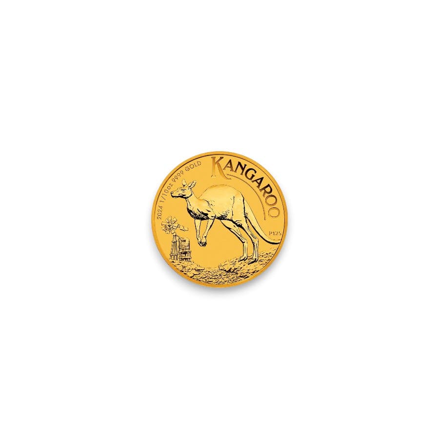 The 2024 1/10 oz Gold Australian Kangaroo coin, minted in .9999 fine gold and carrying a denomination of $15 AUD, marks a significant edition in the Perth Mint's celebrated series, featuring a fresh depiction of Australia's iconic kangaroo against a backdrop that captures the essence of the Australian landscape. This year's release is notably distinguished by the introduction of King Charles III's effigy on the obverse, heralding a new era in the coin's design that aligns with the transition in the British monarchy, a momentous occasion for collectors and royal watchers alike. The Perth Mint's meticulous craftsmanship and the coin's pure gold content blend the allure of numismatic art with investment appeal, making the 2024 Gold Kangaroo a sought-after piece for both investors seeking precious metals and collectors drawn to its cultural significance and the historic update of the royal portrait, thereby continuing the legacy of one of Australia's most prestigious bullion coin programs.