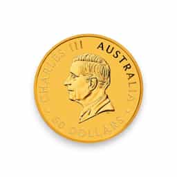 The 2024 1/2 oz Gold Australian Kangaroo $50 Coin, minted in .9999 fine gold by the Perth Mint, features a significant update with King Charles III's effigy on the obverse, marking a new era in the coin's design to reflect the change in the British monarchy. This update follows the tradition of portraying the reigning monarch of the Commonwealth, symbolizing continuity and respect within Australian coinage. The reverse continues to celebrate the iconic kangaroo, capturing the spirit and natural beauty of Australia’s most recognized animal in a new, dynamic design for 2024. This coin is not only a valuable investment piece due to its high gold purity but also a collector's item that bridges the transition between monarchs. With a face value of $50, the 2024 Gold Kangaroo stands as a testament to the Perth Mint's excellence in craftsmanship and design, offering collectors and investors alike a piece of numismatic history and a pure gold asset.