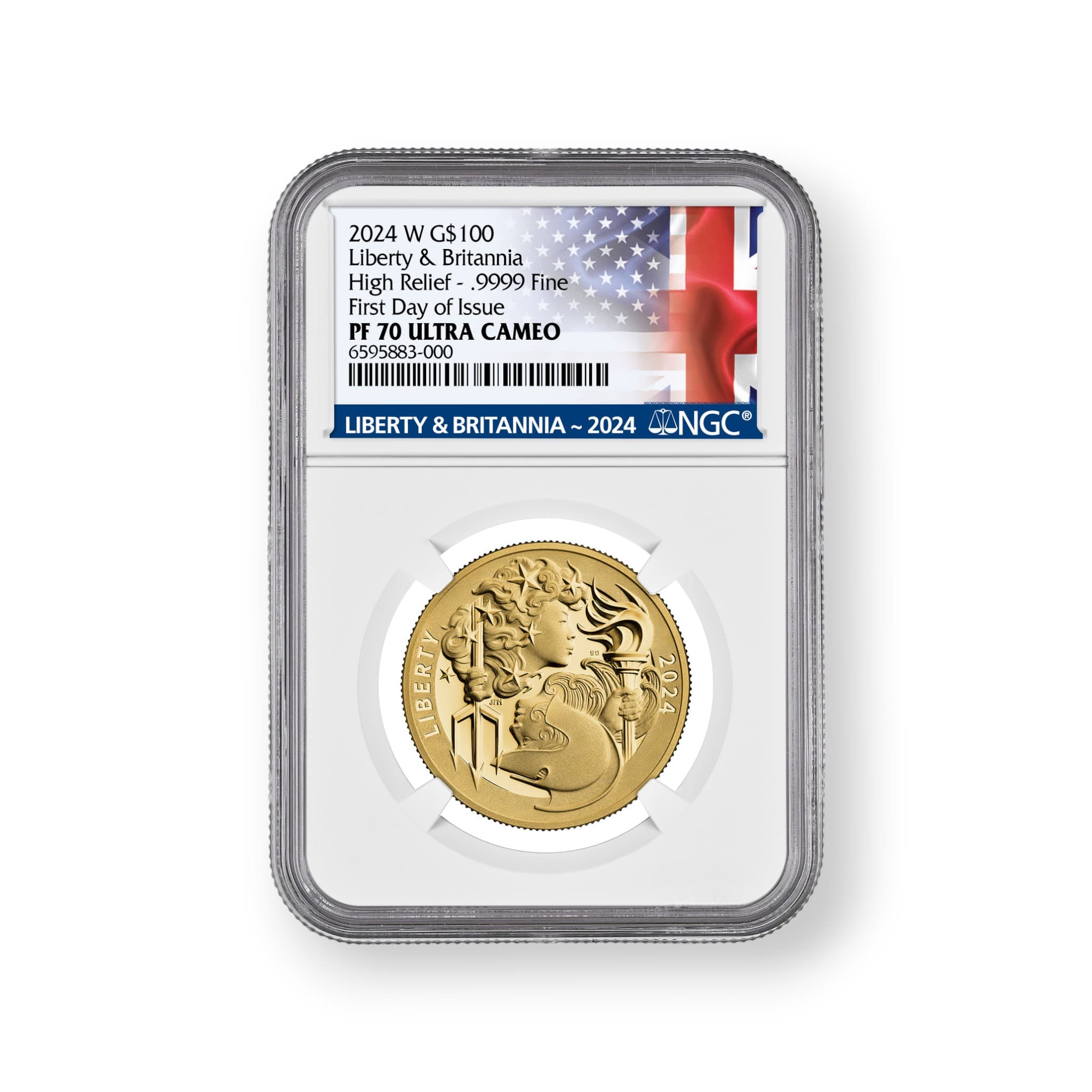 The 2024 Liberty & Britannia High Relief 1 oz Gold $100 Coin is a stunning collaboration between the United States Mint and the Royal Mint, celebrating the enduring friendship between the United States and the United Kingdom. Crafted from .9999 fine gold, this one-ounce coin features a high relief design showcasing the iconic figures of Lady Liberty and Britannia standing together, symbolizing the shared values and historic ties between the two nations. Each coin is individually certified by NGC, ensuring its authenticity and quality, making it a must-have for collectors and investors alike.