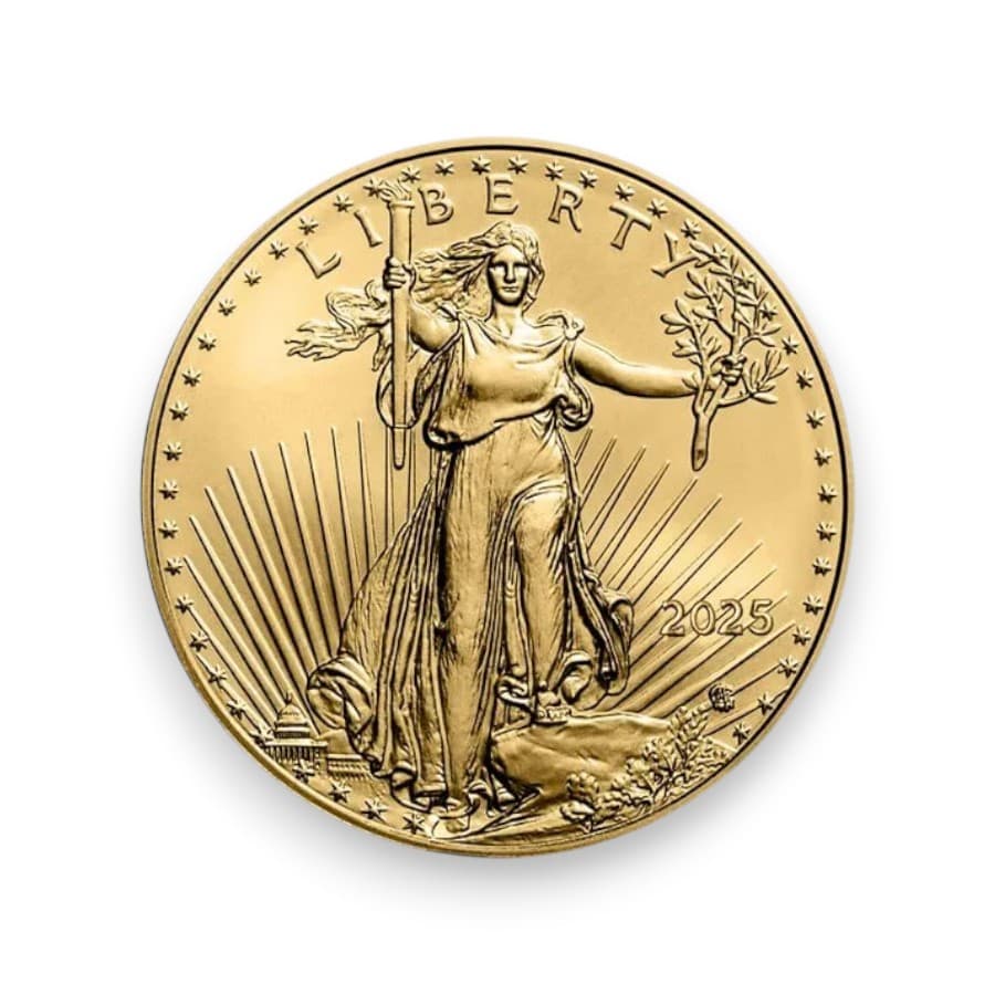 The 2025 American Gold Eagle 1 oz $50 Coin features a beautiful design with Lady Liberty on the obverse, symbolizing freedom and strength. The reverse showcases a family of eagles, emphasizing the nation’s heritage. Made of 22-karat gold, the coin contains one troy ounce of pure gold and is legal tender with a face value of $50. It is a highly sought-after investment and collectible item, recognized worldwide for its craftsmanship and intrinsic value. The 2025 American Gold Eagle is also backed by the U.S. government for weight and purity, making it a trusted and valuable addition to any portfolio or collection.