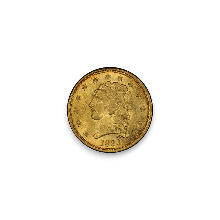 The $2.5 Gold Classic Head Quarter Eagle is a U.S. coin that was minted from 1834 to 1839. It features a left-facing bust of Liberty wearing a headband inscribed with "LIBERTY," known as the "Classic Head." This design was created by Chief Engraver William Kneass or perhaps by Christian Gobrecht. Notably, the Classic Head design represented a departure from the previous "Capped Bust" imagery and the coin's composition was also changed during this era to a standard of .900 fine gold as a result of the Coinage Act of 1834, which sought to adjust the coinage in response to the increasing value of gold.