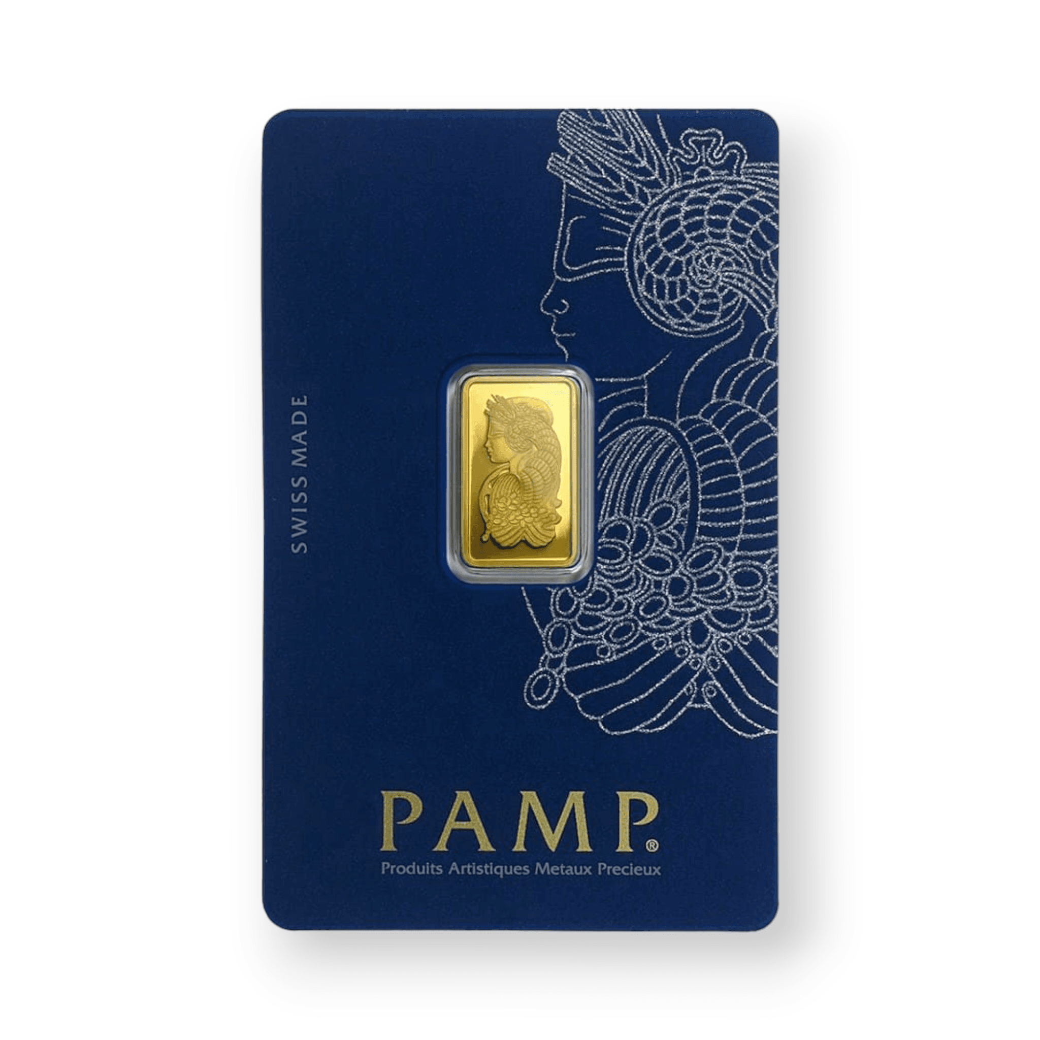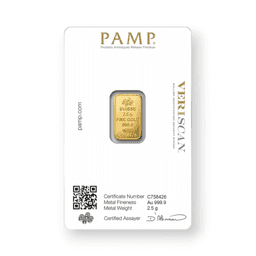 The 2.5 Gram Pamp Gold Bar, with a purity of .9999 fine and sealed in an assay card, is a notable product from PAMP Suisse, a prestigious name in the precious metals industry. This bar consists of 2.5 grams of 99.99% pure gold, exemplifying PAMP's high standards in producing gold bullion. Renowned for their meticulous craftsmanship, PAMP Suisse bars often feature exquisite designs, ranging from traditional motifs to modern artistic interpretations, enhancing their appeal. The bar comes enclosed in a tamper-evident assay card, which provides both protection and a guarantee of authenticity. This card includes essential details like the bar's weight, purity, and a unique serial number for security and verification purposes. These bars are particularly attractive to investors and collectors who appreciate the fine quality of PAMP Suisse products, the high purity of the gold, and the security offered by the assay card, making them a valuable choice for diversifying portfolios with small increments of gold.
