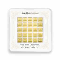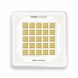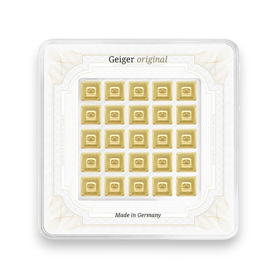 The 25 x 1 Gram Gold Geiger Original Multicard, sealed within a carded assay by Geiger Edelmetalle AG, represents an exemplary blend of innovation, flexibility, and security in gold investment. Crafted with .9999 fine gold, this multicard divides 25 grams of gold into 25 easily separable 1 gram bars, each featuring the esteemed design of Schloss Güldengossa, symbolizing Geiger's dedication to excellence in the precious metals industry. Advanced security features, including UV-light-readable elements and a unique serial number for each bar, underscore the meticulous attention to authenticity and purity. Ideal for investors seeking portfolio diversification or for those desiring to gift precious gold in smaller increments, the Geiger Original Multicard combines the tangible value of gold with the practicality and assurance of investing through one of the world's leading precious metal refineries. This product not only facilitates easy distribution and transaction of gold but also stands as a testament to Geiger Edelmetalle's innovation and commitment to quality in the realm of precious metals.
