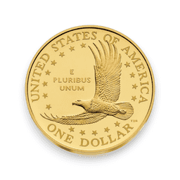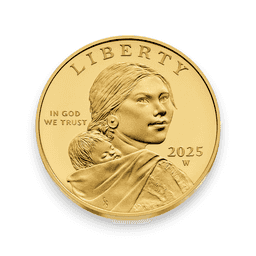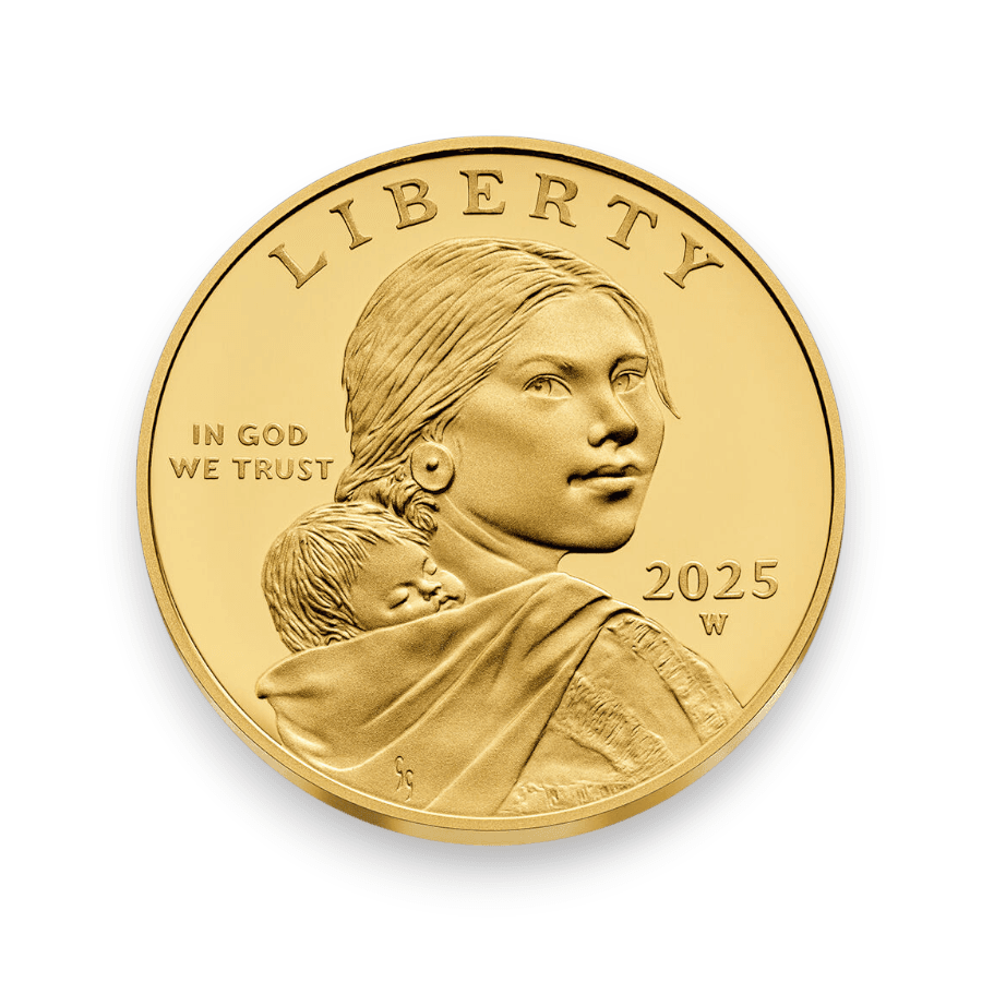 The 25th Anniversary Sacagawea 2025 Golden Dollar 24K One Half‑Ounce Gold Proof Coin (25SG1) is a luminous celebration of a quarter-century since the Sacagawea dollar’s debut. Crafted from .9999 fine 24‑karat gold and weighing a generous half troy ounce, this proof coin showcases two exquisite designs: the gleaming obverse features Sacagawea carrying her infant son, Jean Baptiste, framed by the inscriptions “IN GOD WE TRUST” and the date “2025,” while the reverse reinterprets Glenna Goodacre’s iconic soaring eagle design, encircled by “UNITED STATES OF AMERICA” and “E PLURIBUS UNUM.” Struck to proof quality with mirror-like fields and frosted relief, each coin arrives in a deluxe display case complete with a satin-lined interior and has a low, limited mintage, making it a rare and elegant commemorative piece.