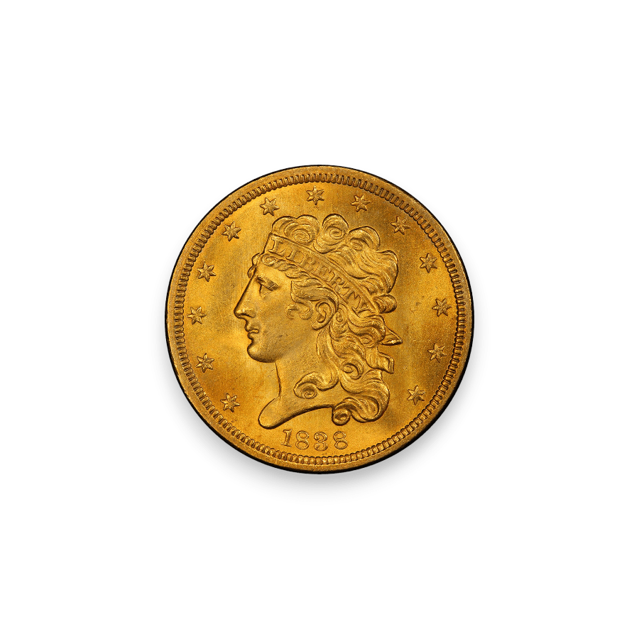 The $5 Gold Classic Head Half Eagle is an early American coin minted from 1834 to 1838, representing a significant change in US gold coinage. The obverse features a left-facing bust of Liberty wearing a headband inscribed with the word "LIBERTY", which is the defining characteristic of the "Classic Head" design, created by mint engraver William Kneass. The reverse of the coin depicts a simplified heraldic eagle, which is a departure from the previous designs that included the motto "E PLURIBUS UNUM". These coins are composed of 90% gold and 10% copper, and their issuance coincided with the era when the US was reforming its coinage, including decreasing the gold content to discourage melting and exporting of US gold coins.