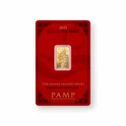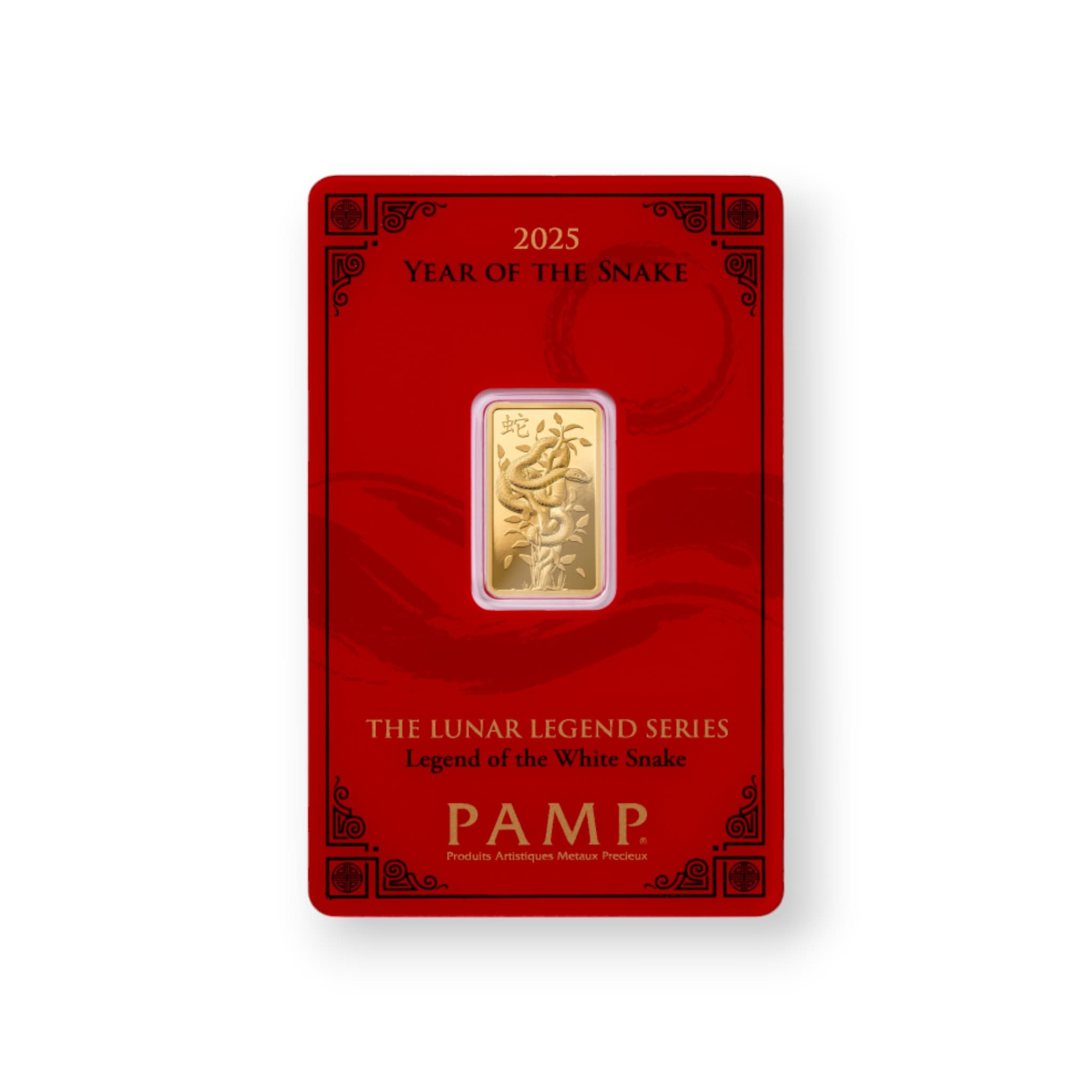 The 5 Gram Gold Bar PAMP Suisse Lunar Legends White Snake is part of PAMP Suisse's esteemed Lunar Legends series, which celebrates the Chinese Zodiac with uniquely designed gold bars. This exquisite bar features a high-relief depiction of the White Snake, a symbol from the Chinese Zodiac that represents wisdom, charm, and financial luck. Struck in 5 grams of .9999 fine gold, this bar not only holds significant investment value due to its purity and weight but also carries cultural significance, making it particularly appealing to collectors interested in zodiac and mythological themes. Each bar is presented in a red assay card verifying its authenticity and weight, enhancing its collectibility and gift appeal. This series is celebrated for its artistry and the Lunar Legends White Snake edition is a coveted piece for both precious metal investors and enthusiasts of culturally rich collectibles.